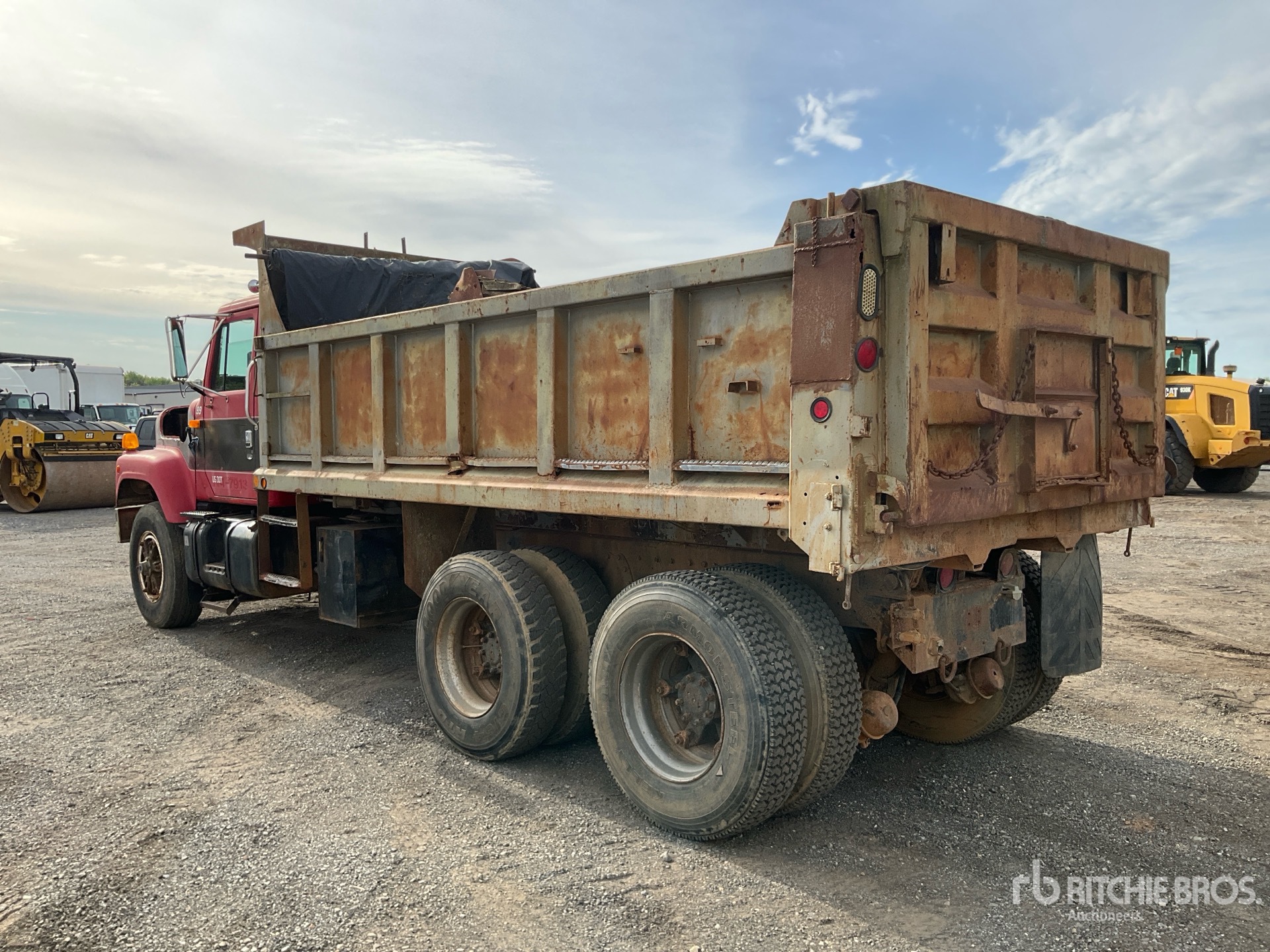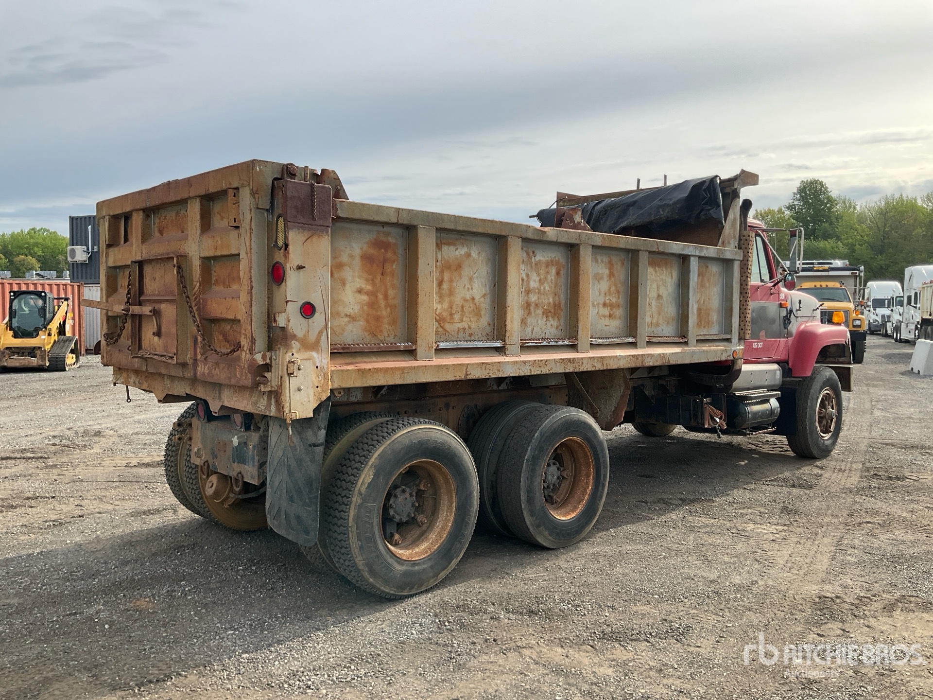1306 Engine hrs, Eaton Fuller 8LL Manual Transmission, Sleeper Air Conditioner, 315/80R22.5 Front Tires, 11R22.5 Rear Tires, Dual Steering Boxes, Double Frame, Spring over Walking Beam Suspension, 211 in Wheelbase, PTO, Hydraulic System, 16 ft Long x 3 ft High Steel Body, Manual Roll Tarp, Tailgate Chute