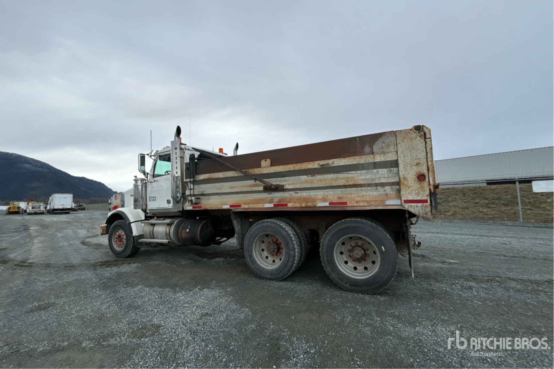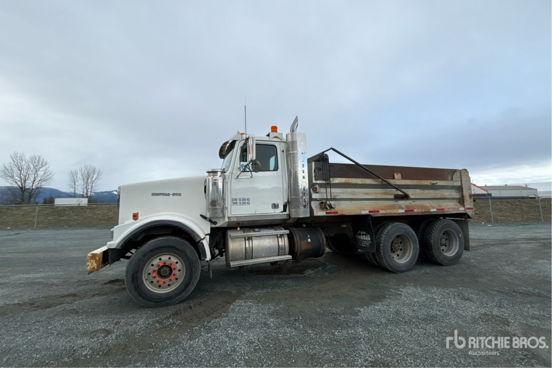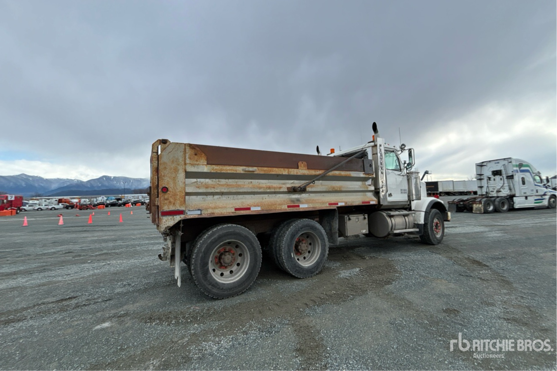Mercedes-Benz OM460LA 6 Cylinder 12.8 L Diesel 435 hp Engine, 2003 US EPA Label, CARB Compliant, 19641 Engine hrs, Engine Brake, Eaton Fuller RTLO-16918B 18-Speed Manual Transmission, Double Differential Locks, 14600 lb Front Axle, 46000 lb Rears, Meritor RT-46-164PEH Drive Axles, 4.30:1 Axle Ratio, 60600 lb GVWR, 385/65R22.5 Front Tires, 11R24.5 Rear Tires, Airliner Air Ride Suspension, 214 in Wheelbase, PTO, 14 ft Long x 3 ft 6 in High Steel Body, Manual Roll Tarp, Tailgate Chute, Pintle Hitch