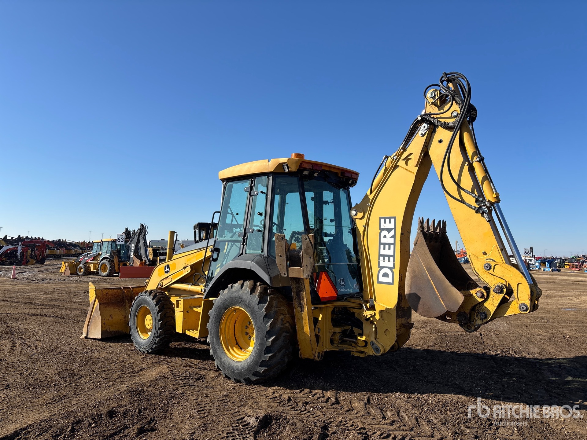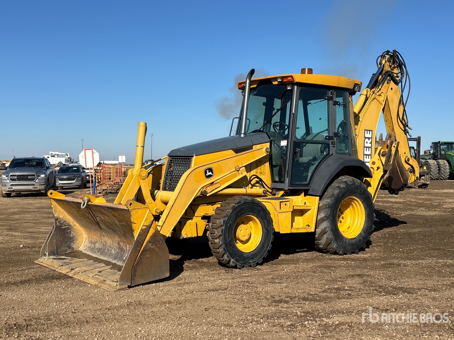 Enclosed Cab, Air Conditioner, Backhoe Pilot Controls, Control Pattern Changer, Powershift Transmission, 2004 US EPA Label, 92 in Loader Bucket, Extendable Stick, Quick Coupler, 24 in Backhoe Digging Bucket, Rear Auxiliary Hydraulics, NOTICE-TO-US-BIDDERS: this asset is likely exempt from US import tariffs as it was manufactured in the US. Bidders are responsible for confirming with their customs broker