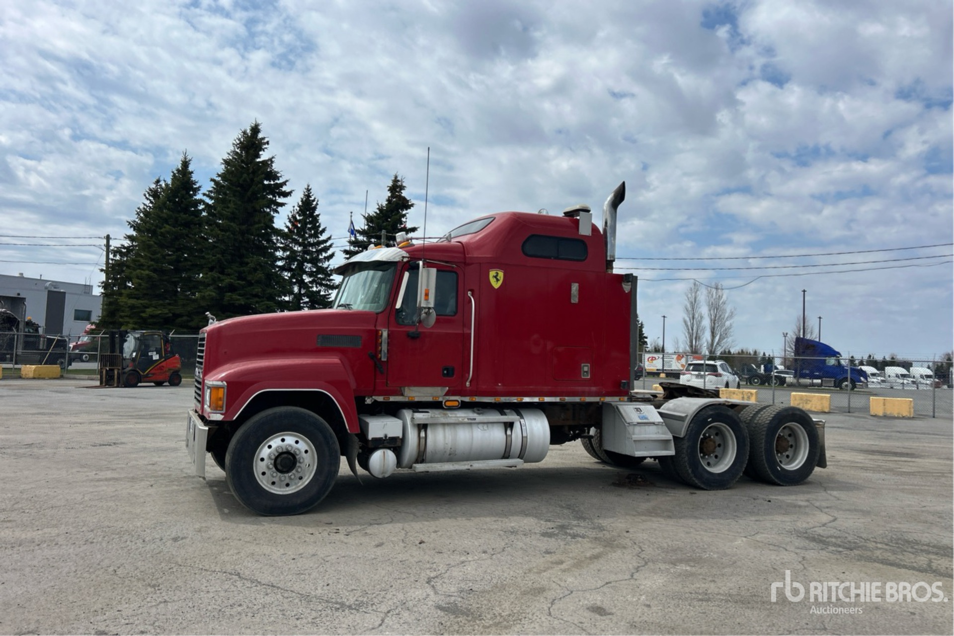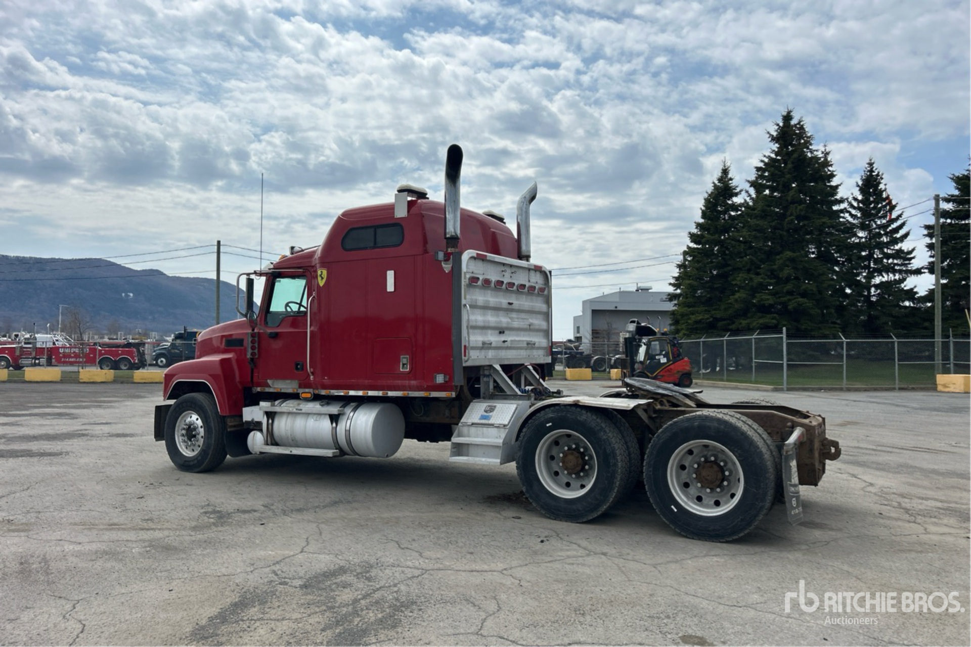 Mack 480 hp Engine, 2004 US EPA Label, 32073 Engine hrs, Eaton Fuller 18-Speed Manual Transmission, 5833 kg Front Axle, 20866 kg Rears, 26699 kg GVWR, Engine Brake, Differential Lock, Mid Roof Sleeper Cab, 239 in Wheelbase, Air Suspension, Aluminum Outer Wheels, 315/80R22.5 Front Tires, 11R24.5 Rear Tires, Dual Fuel Tanks, Headache Rack