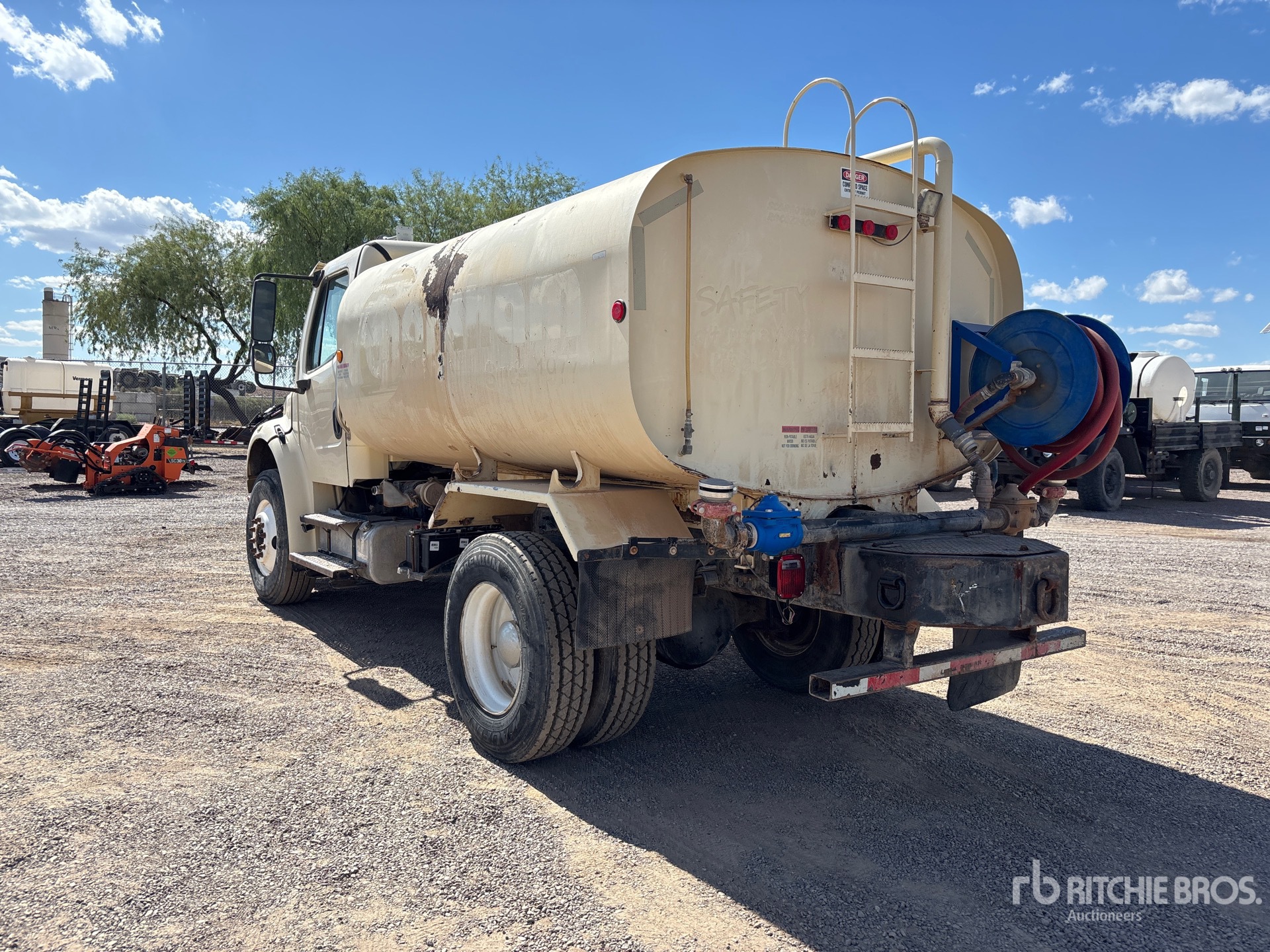 Located in Lane 17 Spot 57, Mercedes-Benz MBE 6 Cylinder 7.2 L Diesel Engine, 2005 US EPA Label, Eaton Fuller 10-Speed Manual Transmission, 12000 lb Front Axle, 23000 lb Rears, 35000 lb GVWR, 11R22.5, Spring Suspension, PTO, Construction Truck and Equipment 1024 2000 gal Steel Tank, PTO Driven Pump, 6 ft, Spray Bar, Hose Reel, Front Spray, Rear Spray, Side Spray