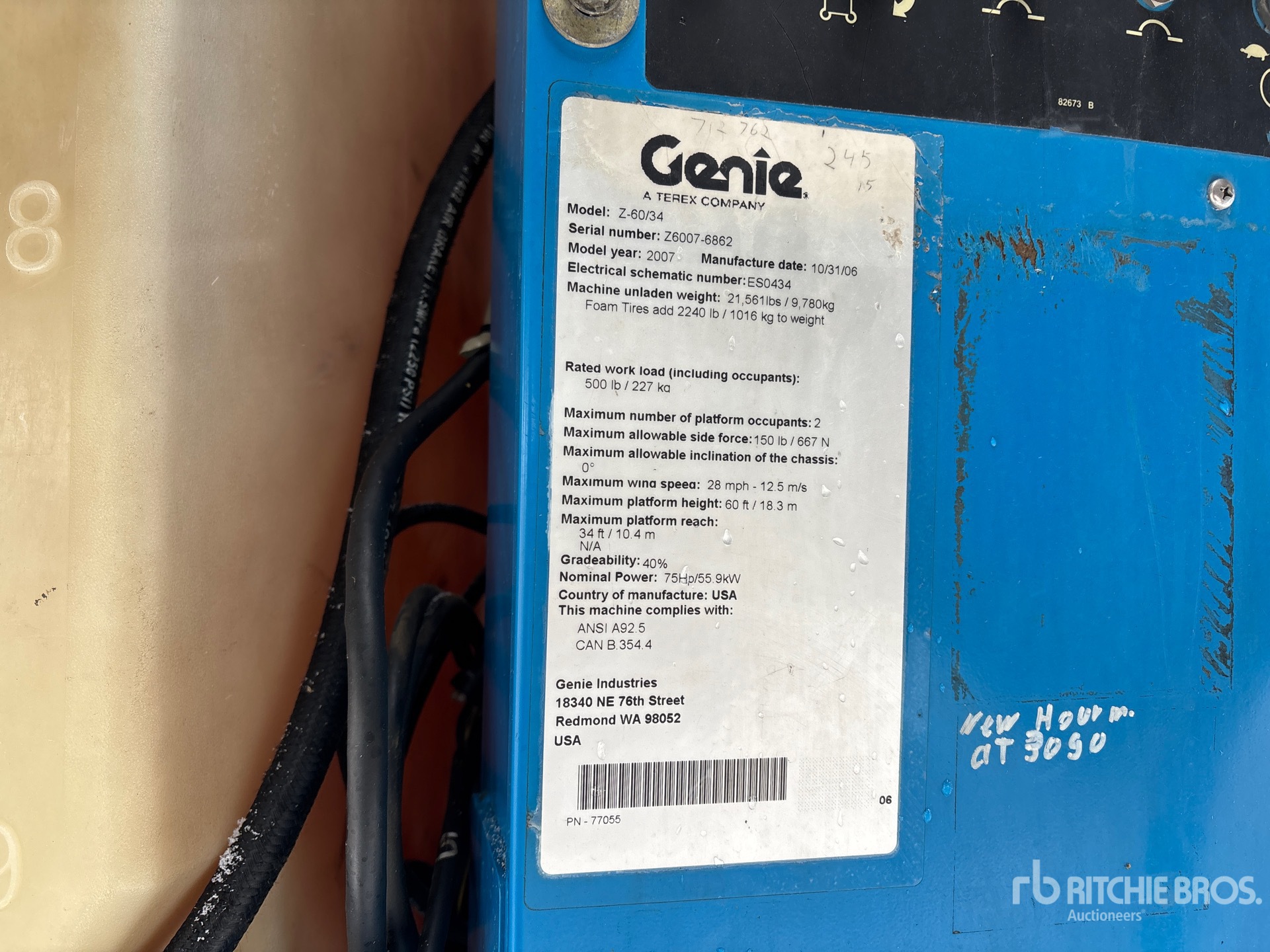 60 ft Max Platform Height, 500 lb Max Weight Capacity, Jib, Power to Platform, Onboard Generator, 4 Cylinder 2.3 L Dual Fuel Engine, 385/65D19.5 Foam-Filled Tires