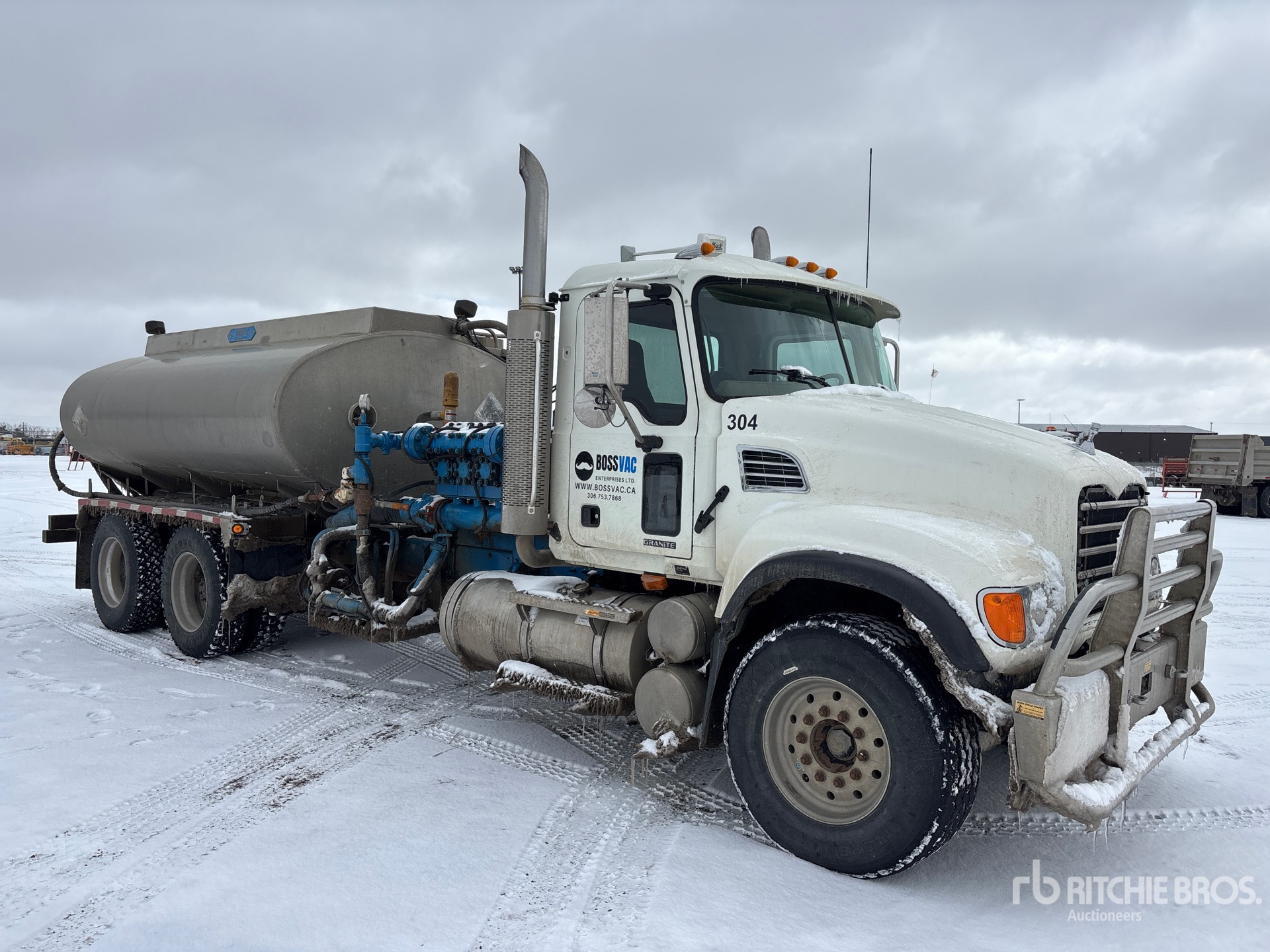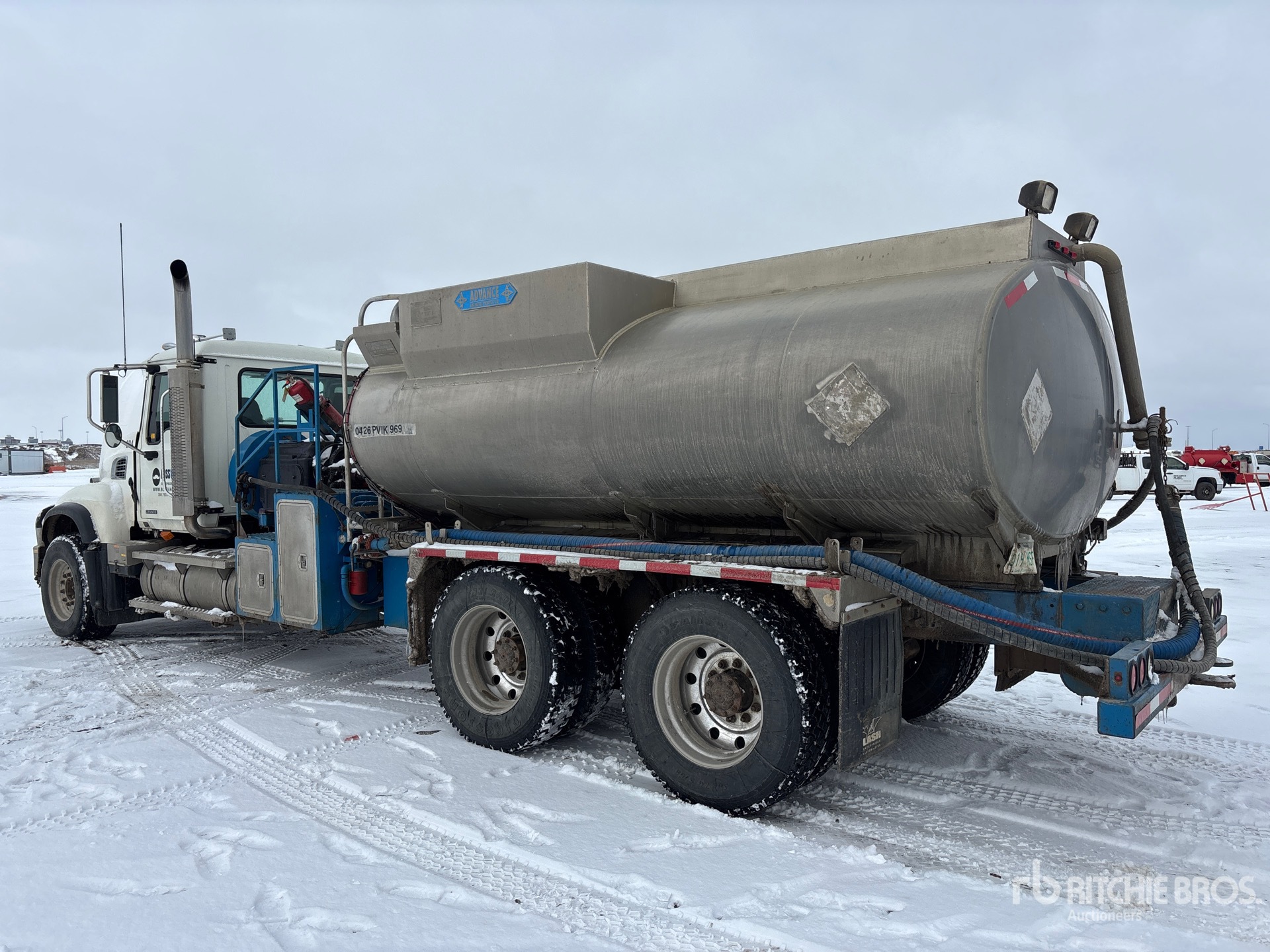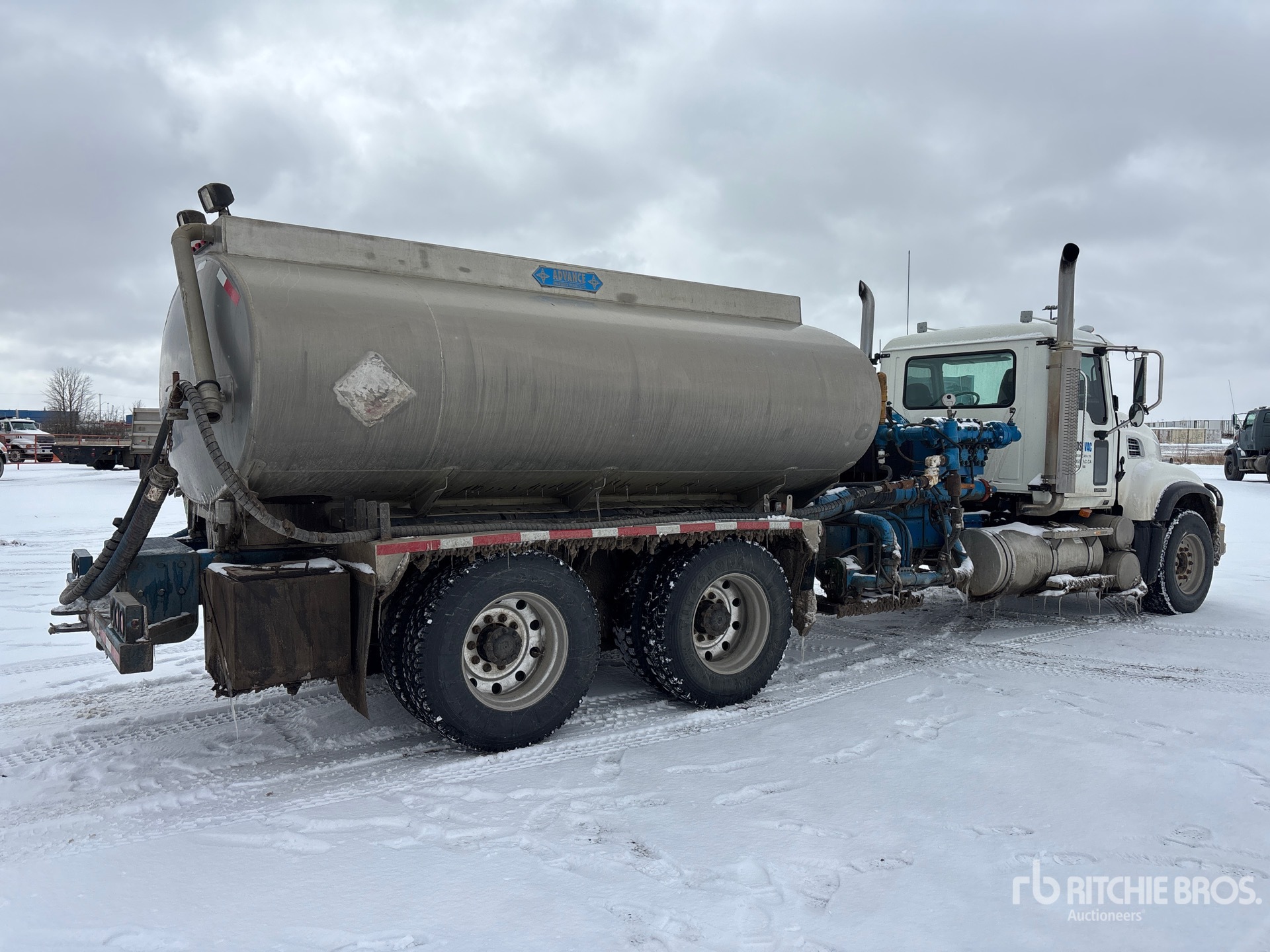 Mack 6 Cylinder 12 L Diesel 460 hp Engine, 2006 US EPA Label, CARB Compliant, Positive Air Shutoff, 19002.9 Engine hrs, Mack Maxitorque 18-Speed Manual Transmission, Differential Lock, 8500 kg Front Axle, 20866 kg Rears, 29366 kg GVWR, Aluminum Wheels, 385/65R22.5 Front Tires, 11R24.5 Rear Tires, Air Ride Suspension, 260 in Wheelbase, PTO, 2000 Gardner Denver Pump, 2007 Advance 11917 L Aluminum Tank, 2 Compartments