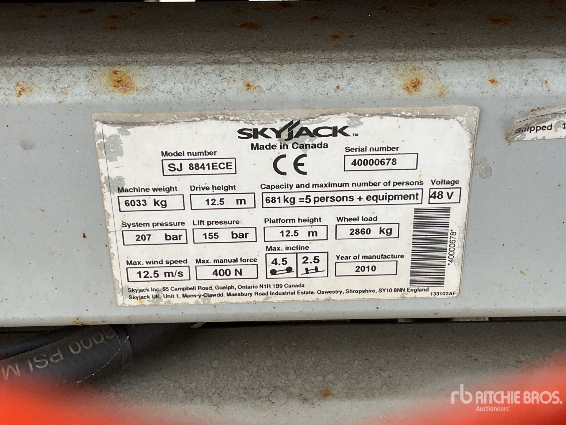 The detailed equipment information is limited in scope, and Ritchie Bros. Auctioneers has not inspected any aspects or components of the equipment other than those expressly set forth herein. Unless expressly stated, we make no representations or warranties, express or implied, concerning the equipment or its components, including without limitation any representations or warranties concerning functionality, conformity or compliance with any safety standard or requirement of any applicable authority or regulatory body, fitness for any particular purpose, or merchantability. You are strongly advised to perform your own detailed inspection of the equipment prior to bidding.