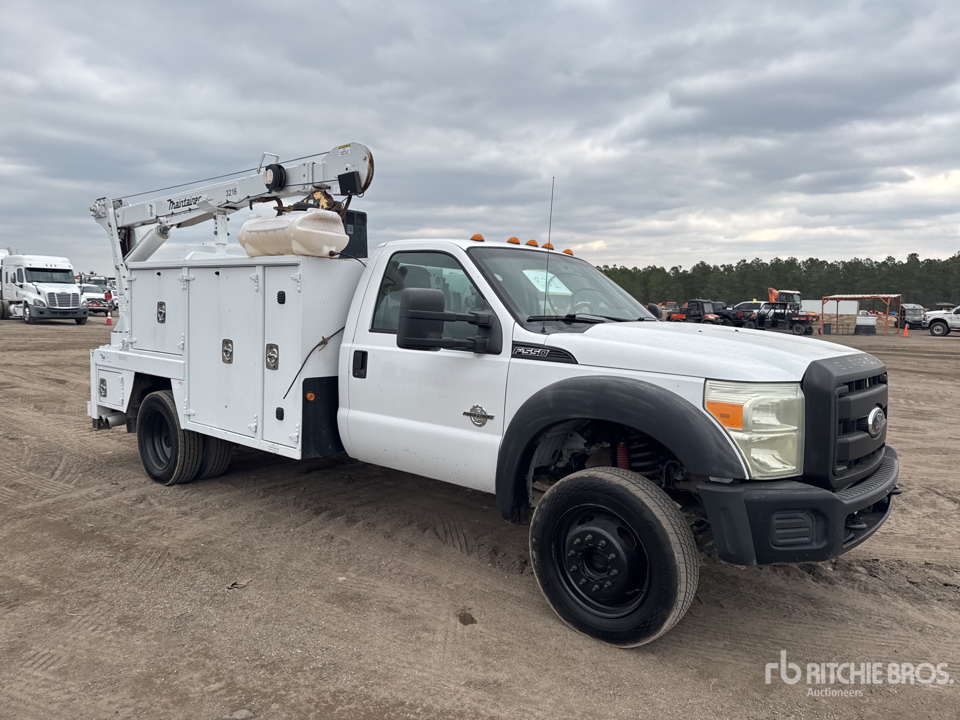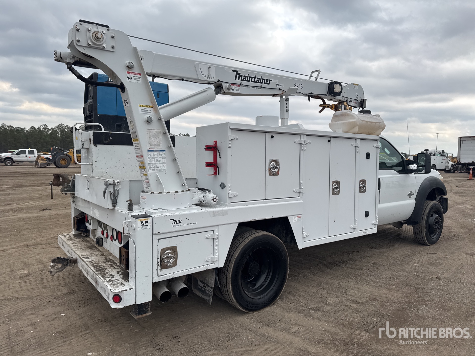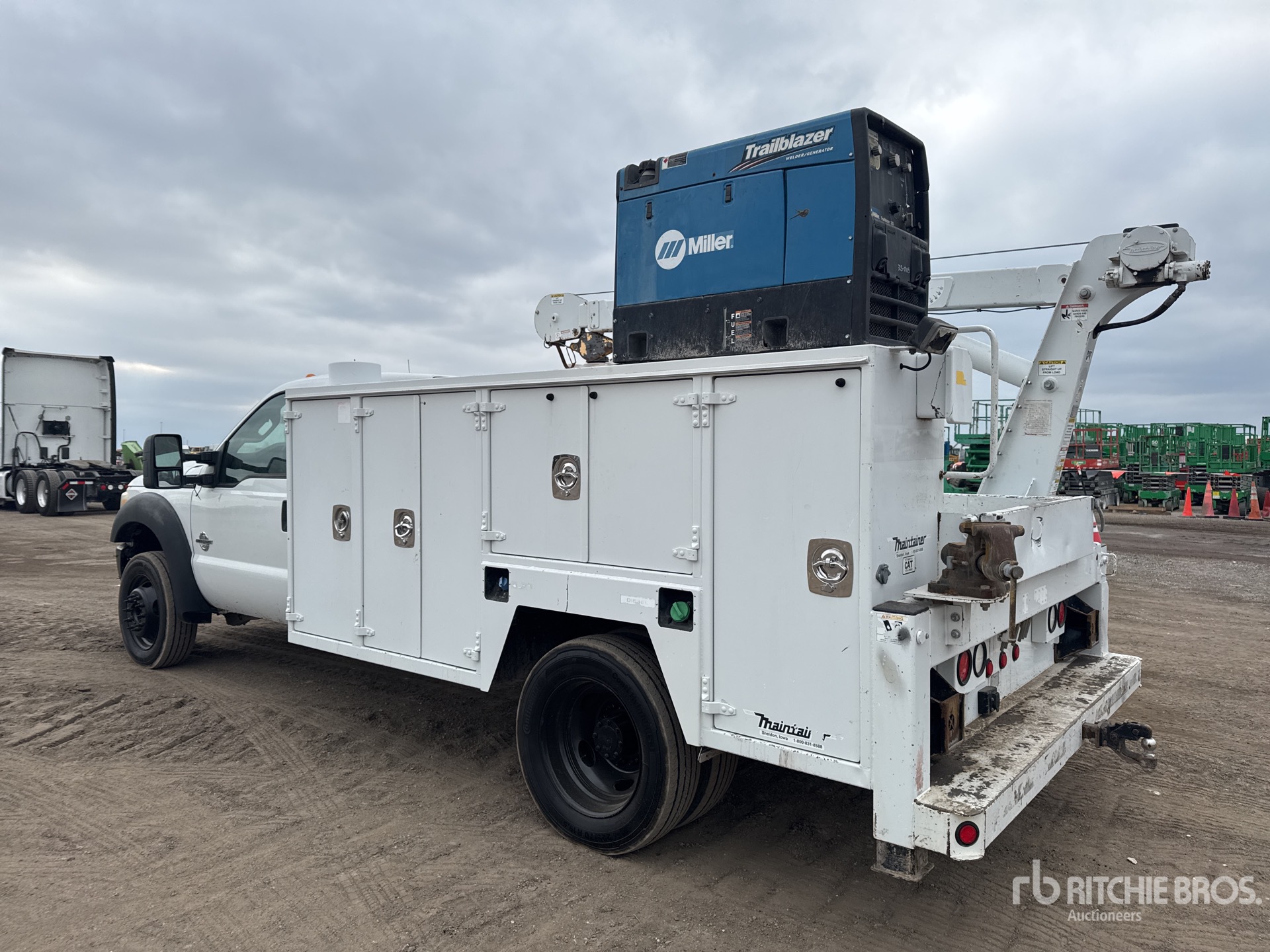 Ford Powerstroke V8 6.7 L Diesel 300 hp Engine, 2011 US EPA Label, Requires Diesel Exhaust Fluid, Automatic Transmission, 6500 lb Front Axle, 14706 lb Rears, 19500 lb GVWR, 225/70R19.5, Spring Suspension, 165 in Wheelbase, PTO, 2011 MAINTAINER 10 ft 6 in Body, Hydraulic Stabilizers, 2011 MAINTAINER 3216TT 4880 lb 2 Section Hydraulic Crane, Wired Remote Control, Miller Trailblazer 325 12000 W Gasoline Generator Set, Miller Trailblazer 325 12000 W Gasoline Welder
