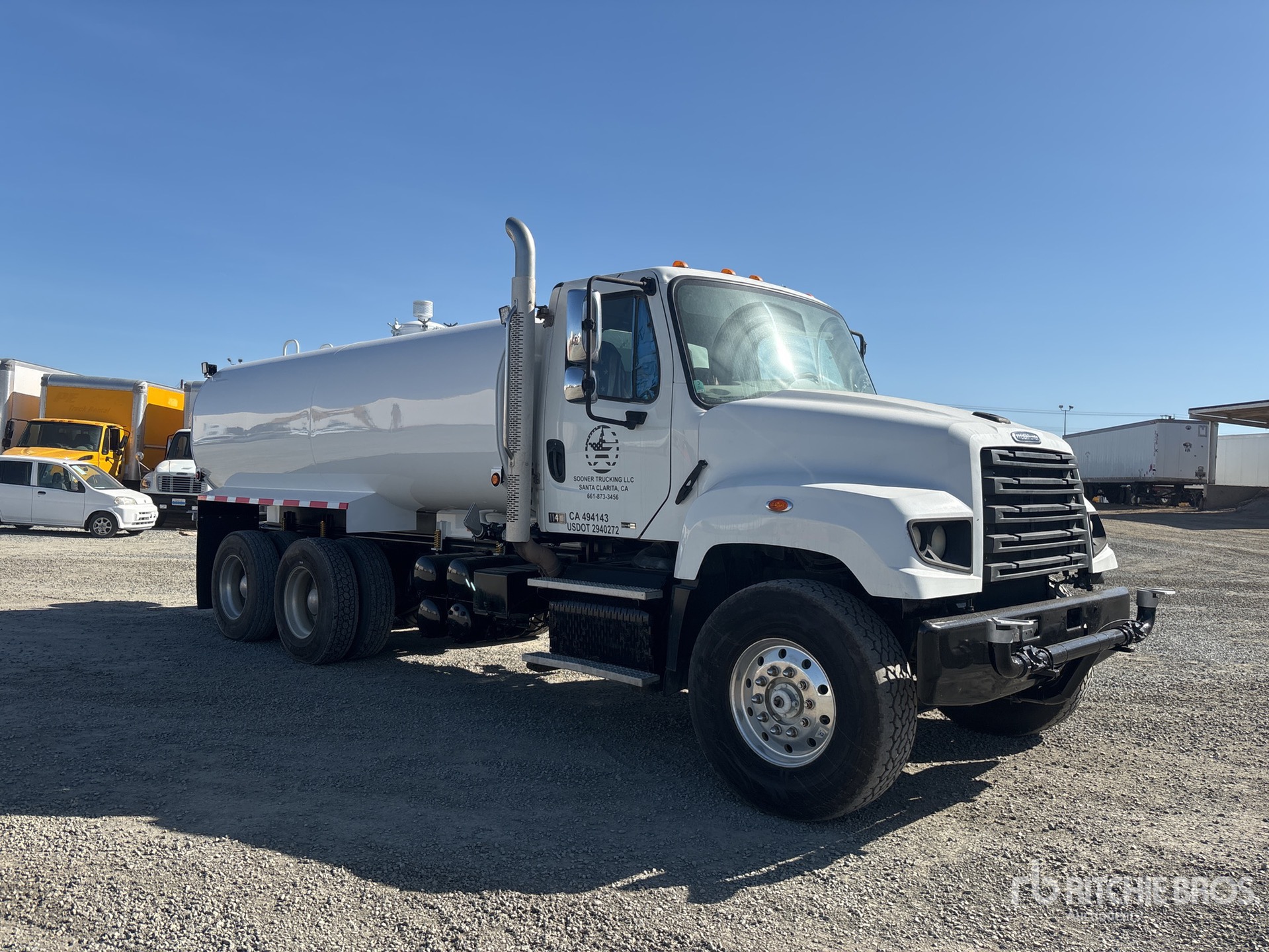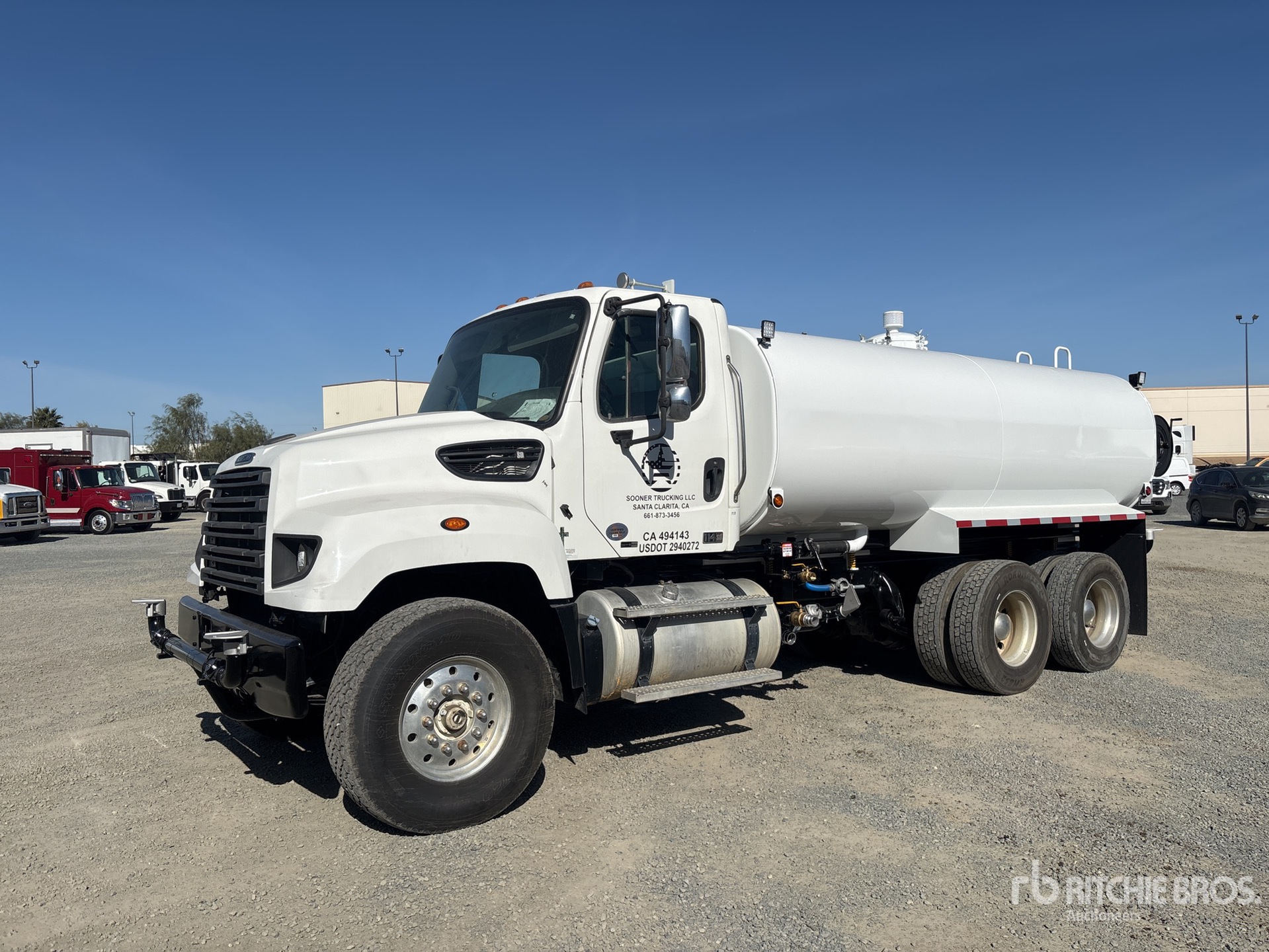 Detroit DD13 6 Cylinder 12.8 L Diesel 450 hp Engine, Eaton Fuller FRO-16210C 10-Speed Manual Transmission, 20000 lb Front Axle, 46000 lb Rears, 4.10:1 Axle Ratio, Aluminum Wheels, 425/65R22.5 Front Tires, 11R22.5 Rear Tires, Dual Steering Boxes, Double Frame, Airliner Air Ride Suspension, 269 in Wheelbase, 4000 gal Steel Tank, PTO Driven Pump, Hose Reel, Front Spray, Rear Spray, Side Spray