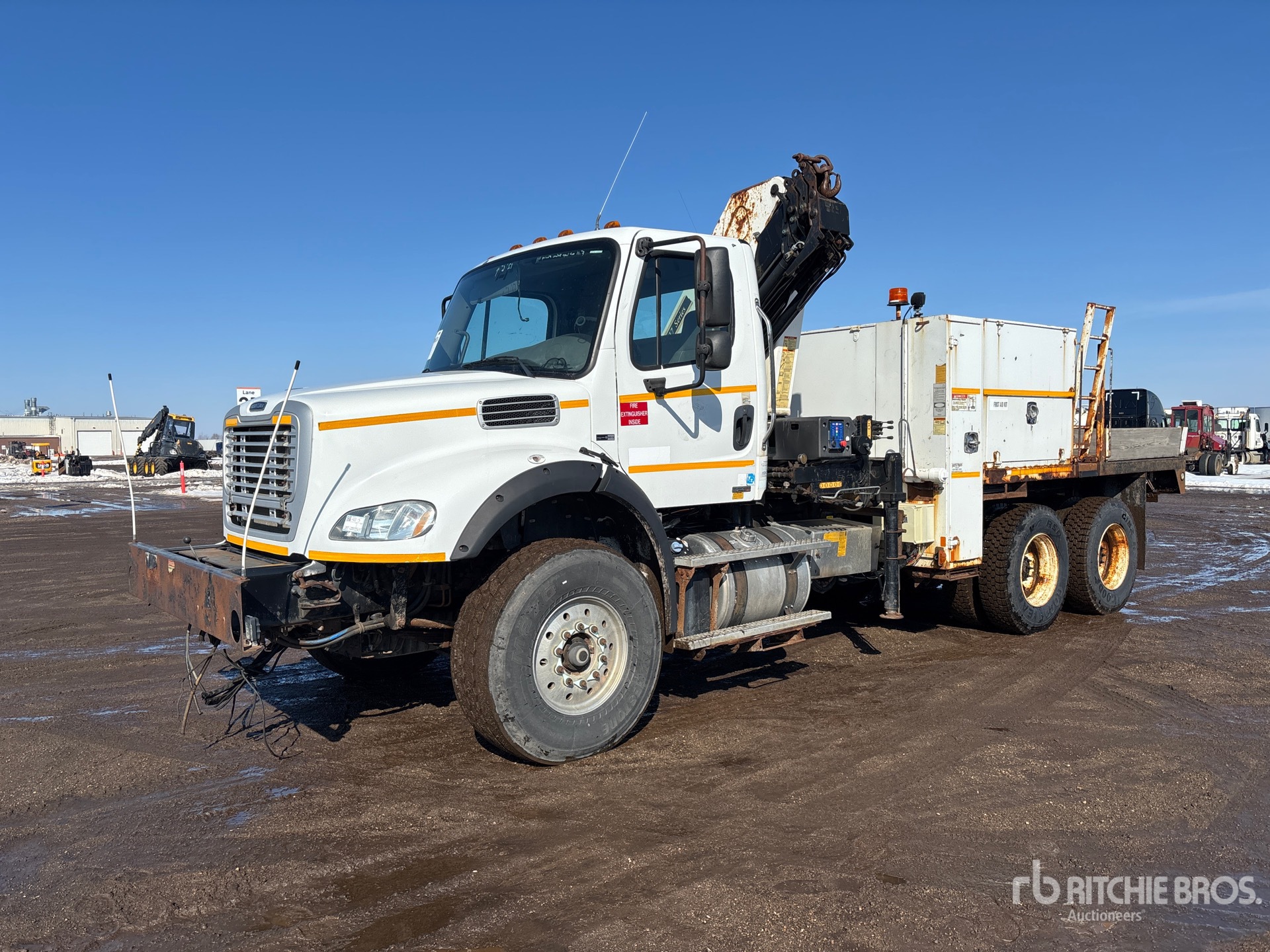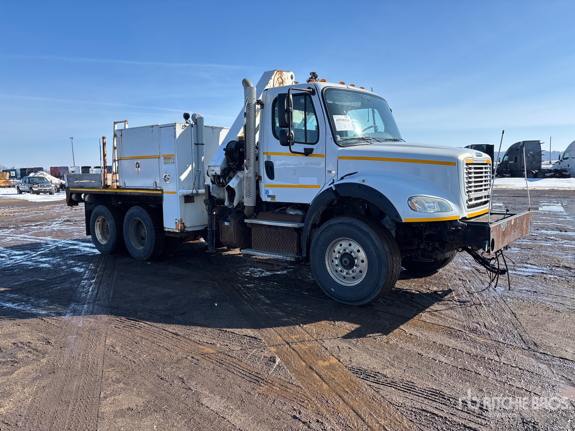 Located in Lane 9 Spot 24, Detroit DD13 6 Cylinder 12.8 L Diesel Engine, 2012 US EPA Label, Eaton Fuller RTO-16908LL 8LL Manual Transmission, Differential Lock, 425/65R22.5 Front Tires, 11R22.5 Rear Tires, Airliner Air Ride Suspension, 207 in Wheelbase, PTO, 9 ft - 50 ft 3 Section Boom, Out and Down Outriggers, Cordless Remote Control, Imt 17/117 5200 lb 2 Section Hydraulic Crane, 13 ft 6 in x 96 in Bed, Pintle Hitch, Detroit DD13 6 Cylinder 12.8 cid Diesel 410 hp Engine, 2012 US EPA Label, Requires Diesel Exhaust Fluid, 9095 Engine hrs, Air Conditioner, Cruise Control, Engine Brake, Eaton Fuller RTO-16908LL 8LL Manual Transmission, Differential Lock, 20000 lb Front Axle, 40000 lb Rears, 3.90:1 Axle Ratio, 60000 lb GVWR, Air Ride Cab, Aluminum Front Wheels, 425/65R22.5 Front Tires, 11R22.5 Rear Tires, Dual Steering Boxes, Double Frame, Air Ride Suspension, 207 in Wheelbase, PTO, 14 ft 6 in Body, Hydraulic Stabilizers, IMT 17/117SLK4 11465 lb 6 Section Hydraulic Crane, Wireless Remote Control