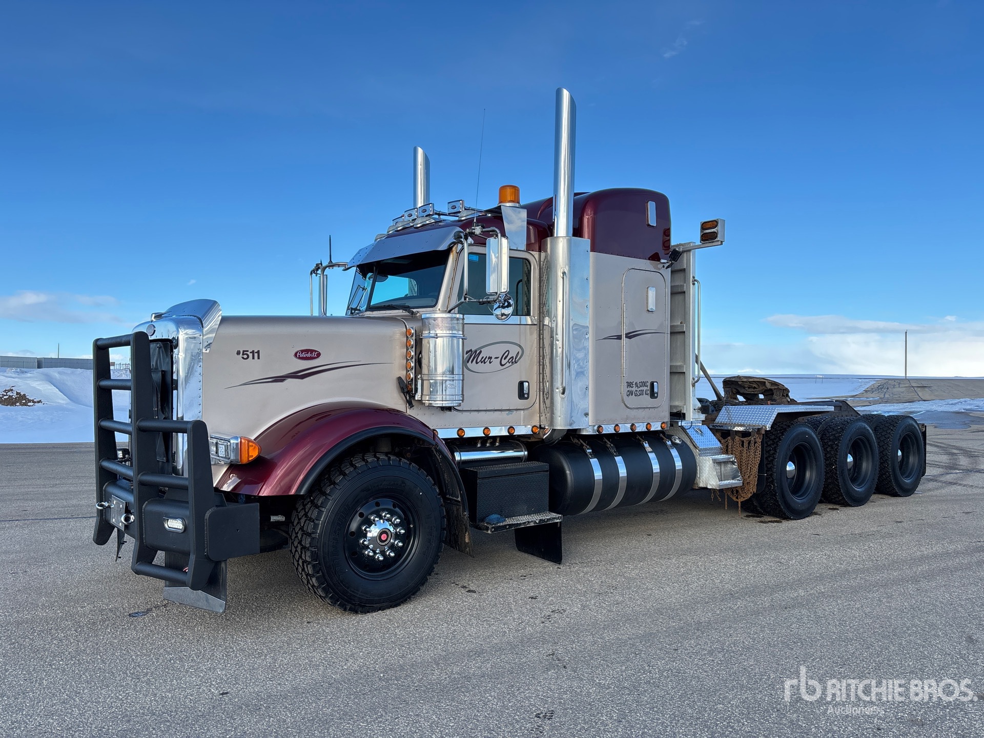 Located in Lane 1 Spot 30, Cummins ISX Engine, 18343 Engine hrs, Eaton Fuller 18-Speed Manual Transmission, 18000 lb Front Axle, 64000 lb Rears, 82000 lb GVWR, Engine Brake, 48 in Mid Roof Sleeper Cab, 266 in Wheelbase, Air Suspension, Aluminum Wheels, 385/65R22.5 Front Tires, 11R24.5 Rear Tires, Dual Steering Boxes, Wet Kit, Air Sliding 5th Wheel, Dual Fuel Tanks, Headache Rack, Complete-Retirement-Dispersal-for-Mur-Cal-Services-Ltd