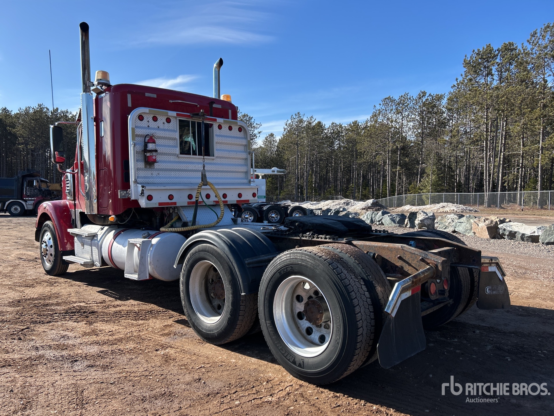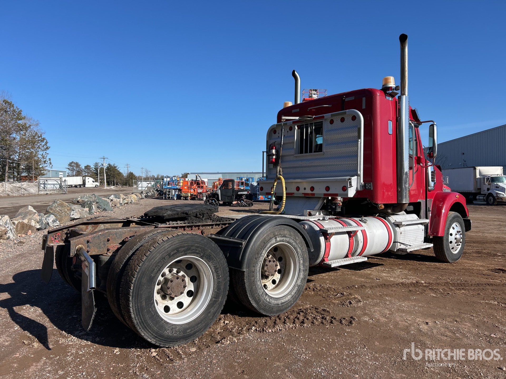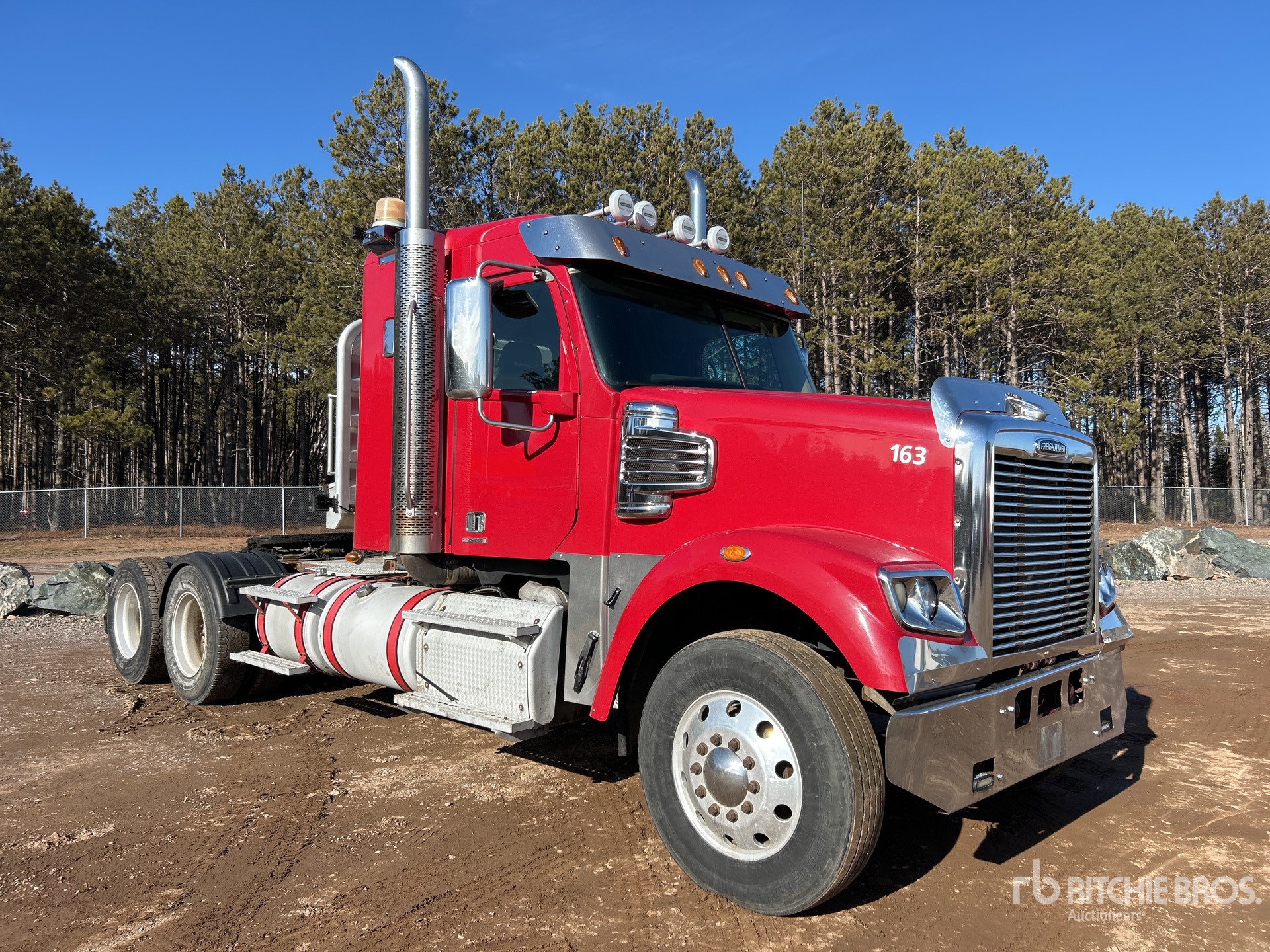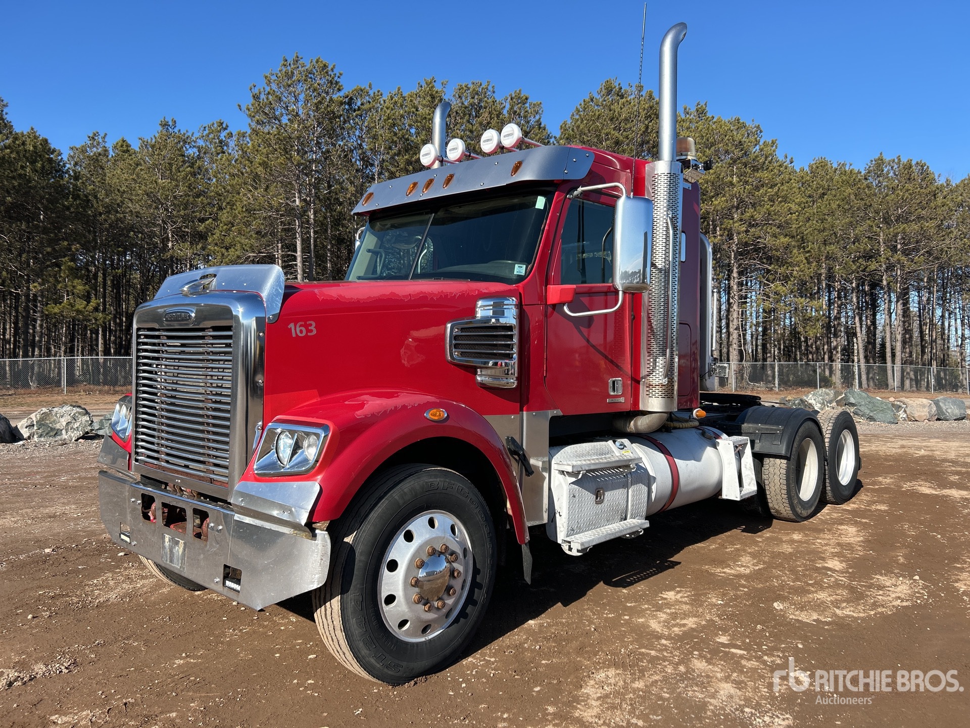 Located in Lane 4 Spot 13, Detroit Engine, 25974 Engine hrs, Eaton Fuller 18-Speed Manual Transmission, 14600 lb Front Axle, 46000 lb Rears, Engine Brake, Differential Lock, 34 in Flat Top Sleeper Cab, 232 in Wheelbase, Air Suspension, Aluminum Wheels, 11R24.5, Wet Kit, Air Sliding 5th Wheel, Dual Fuel Tanks, Headache Rack