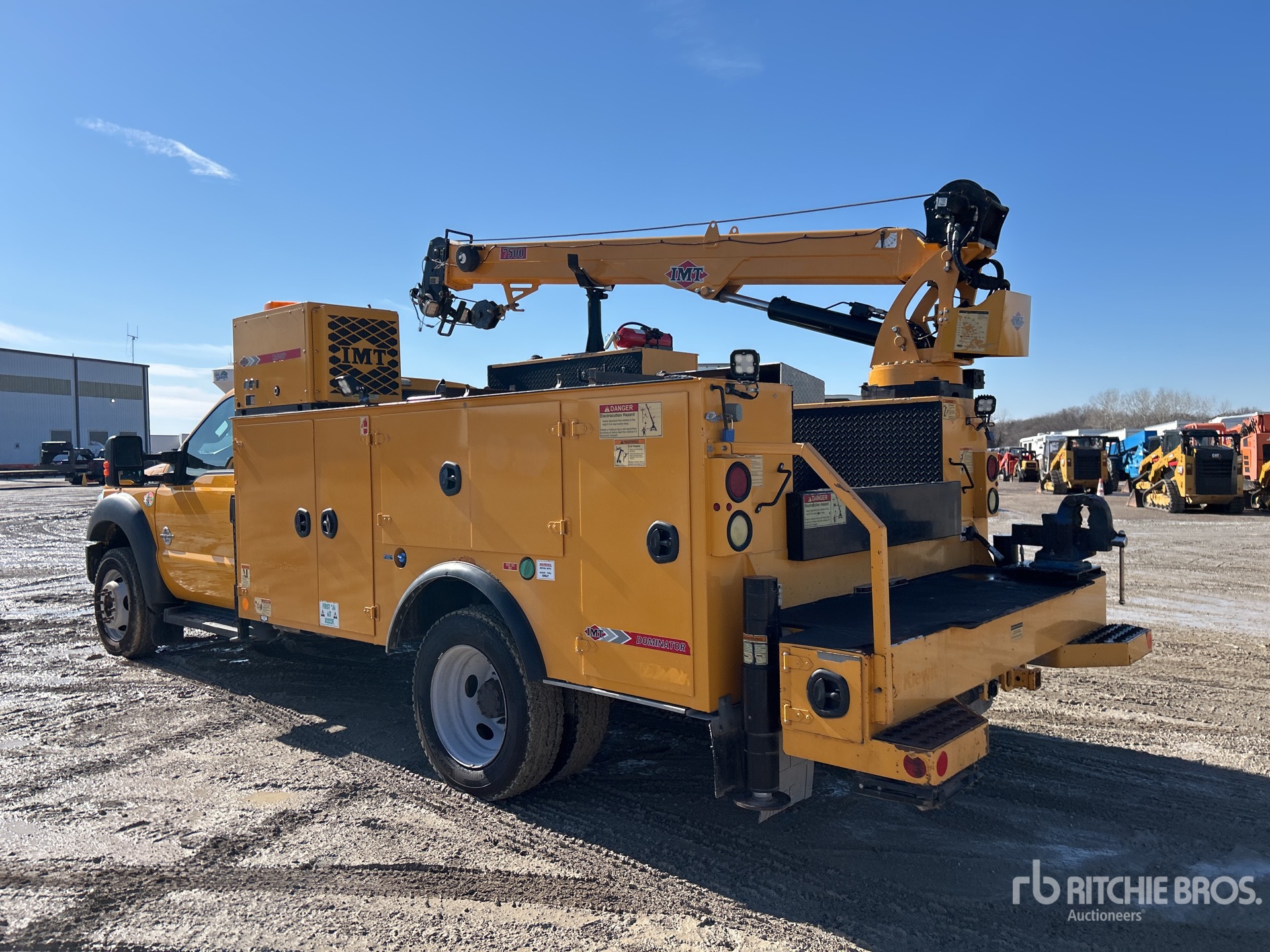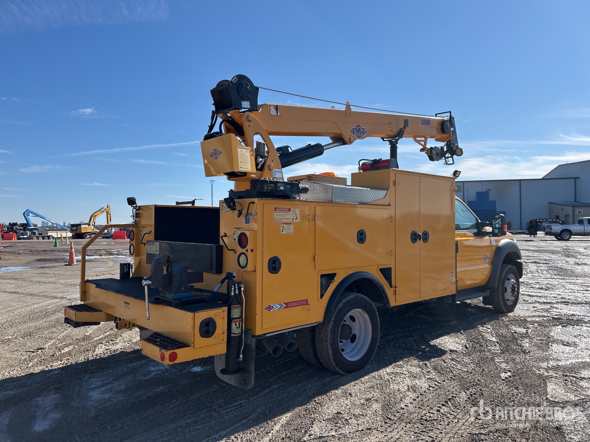 Ford Power Stroke 6.7 L Diesel 300 hp Engine, 2014 US EPA Label, Requires Diesel Exhaust Fluid, Automatic Transmission, 6500 lb Front Axle, 14706 lb Rears, 19500 lb GVWR, 225/70R19.5, Spring Suspension, 165 in Wheelbase, PTO, 14 ft Body, Hydraulic Stabilizers, IMT 7500 lb 3 Section Hydraulic Crane, Wired Remote Control, IMT CAS40P Hydraulic Air Compressor, Air Hose Reel, Miller Trailblazer 325 EFI Diesel Welder
