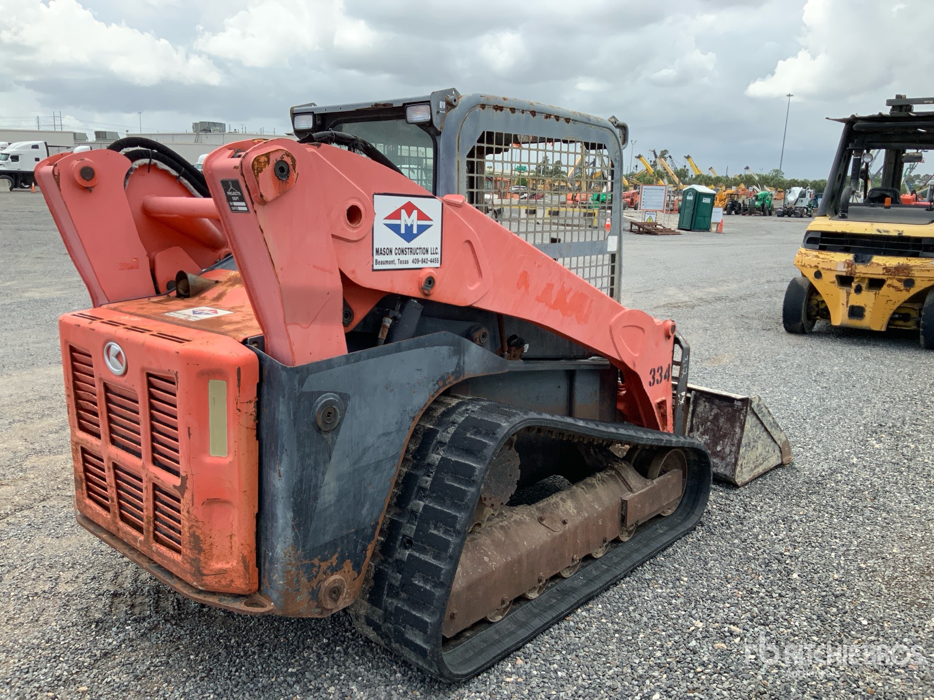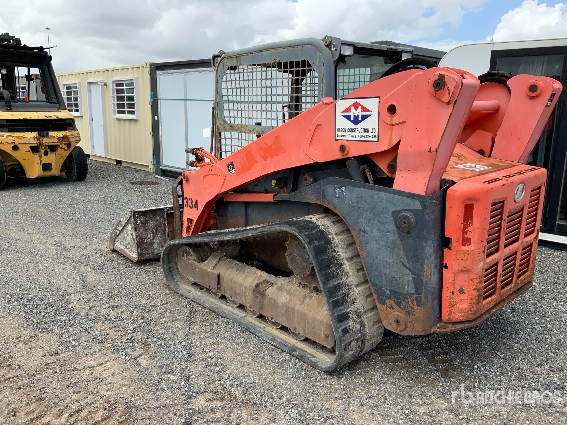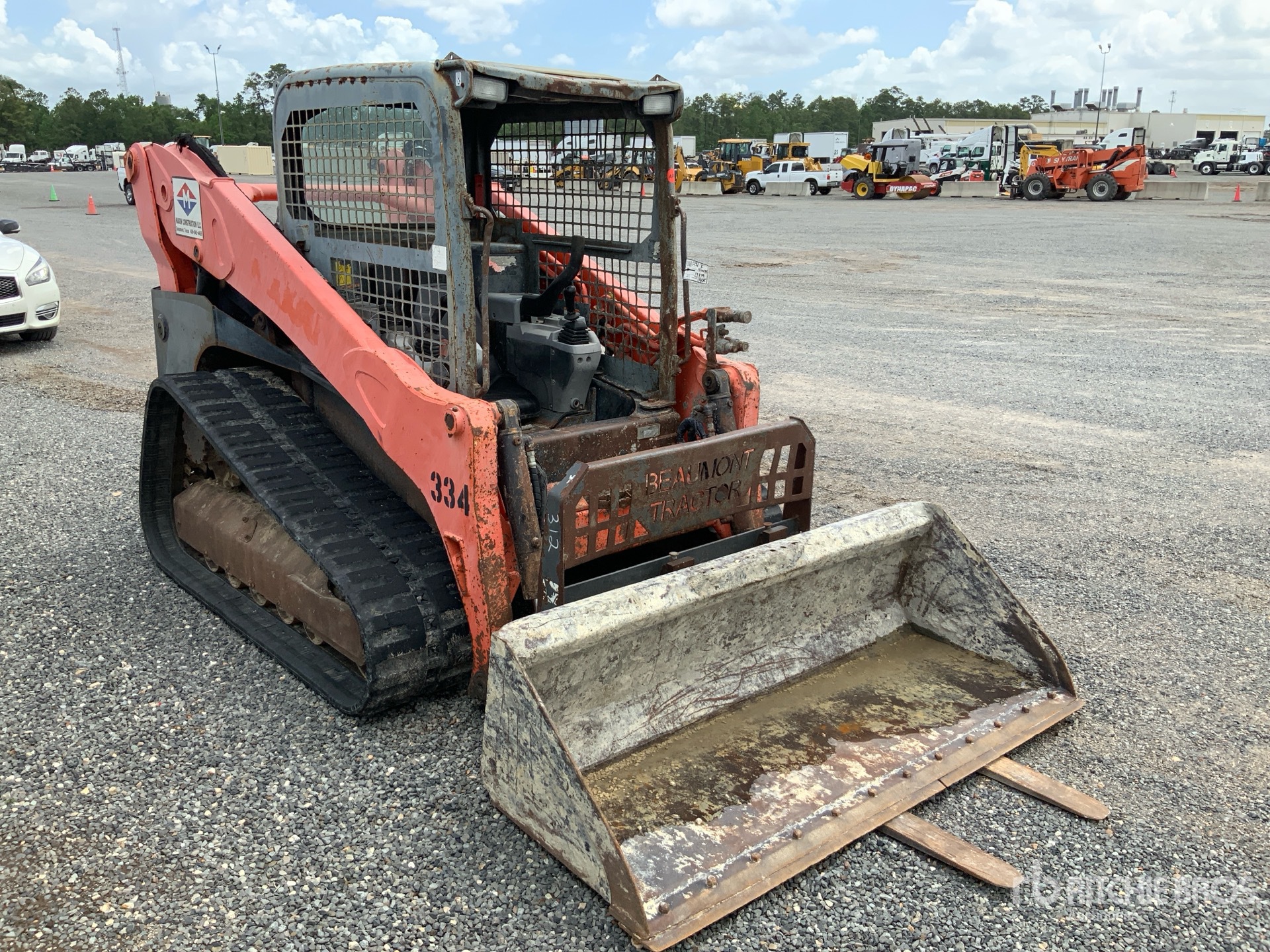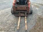 Located in Lane 5 Spot 23, Open Operator Station, Joystick Steering, 17.5 in Track Belts, Manual Coupler, 73 in Multi-Purpose Bucket, Forks