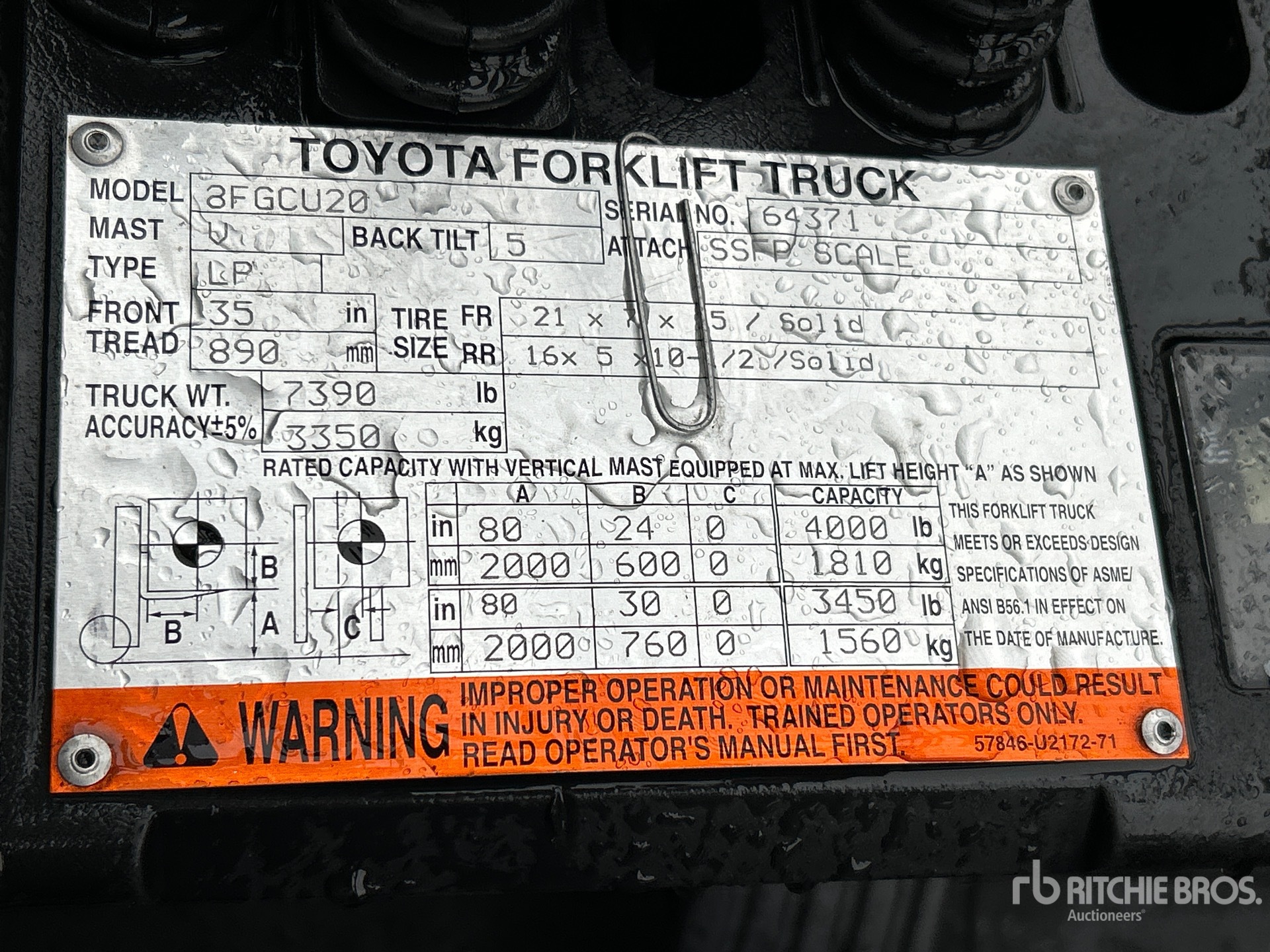 The detailed equipment information is limited in scope, and Ritchie Bros. Auctioneers has not inspected any aspects or components of the equipment other than those expressly set forth herein. Unless expressly stated, we make no representations or warranties, express or implied, concerning the equipment or its components, including without limitation any representations or warranties concerning functionality, conformity or compliance with any safety standard or requirement of any applicable authority or regulatory body, fitness for any particular purpose, or merchantability. You are strongly advised to perform your own detailed inspection of the equipment prior to bidding.