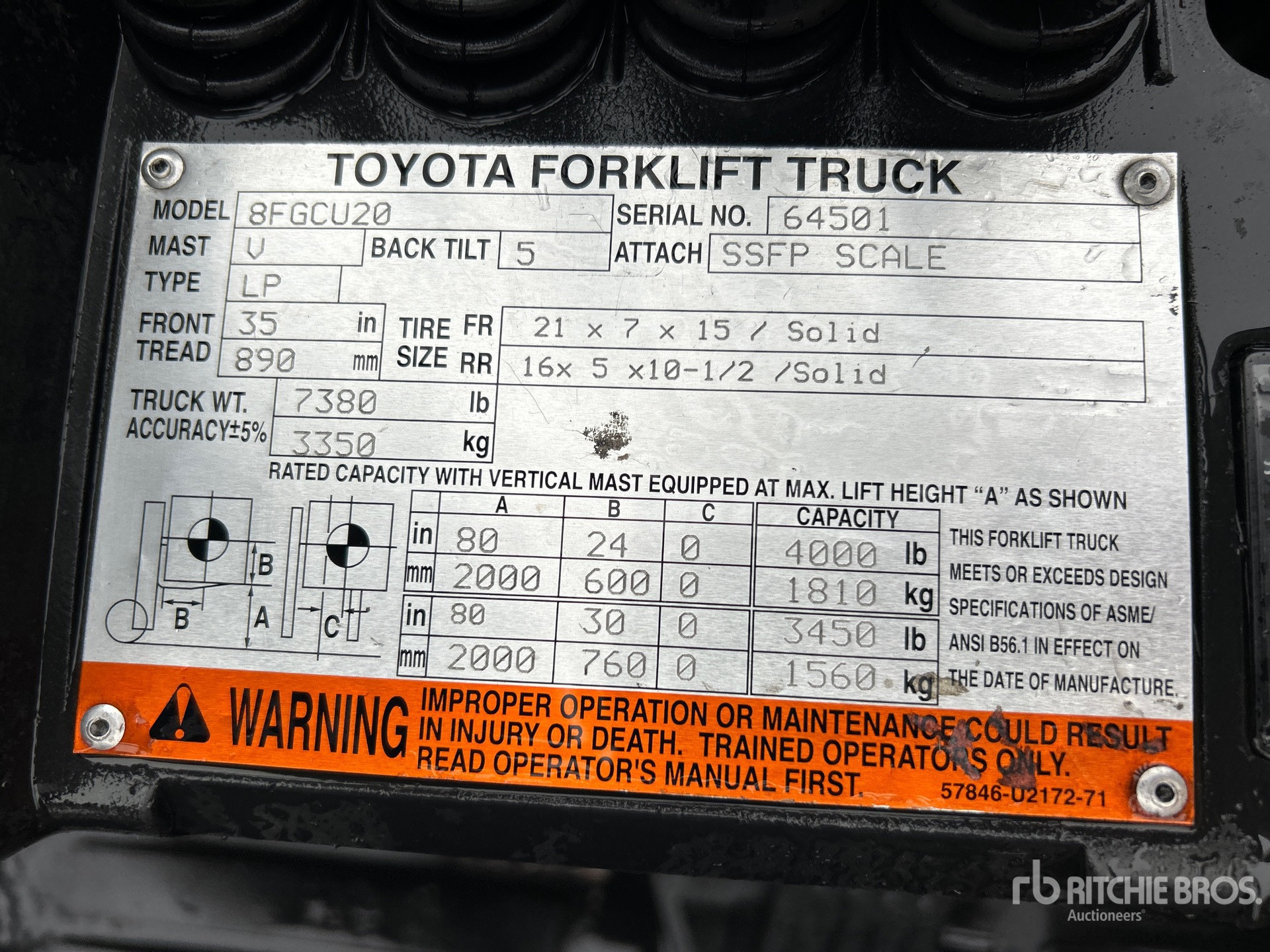 The detailed equipment information is limited in scope, and Ritchie Bros. Auctioneers has not inspected any aspects or components of the equipment other than those expressly set forth herein. Unless expressly stated, we make no representations or warranties, express or implied, concerning the equipment or its components, including without limitation any representations or warranties concerning functionality, conformity or compliance with any safety standard or requirement of any applicable authority or regulatory body, fitness for any particular purpose, or merchantability. You are strongly advised to perform your own detailed inspection of the equipment prior to bidding.