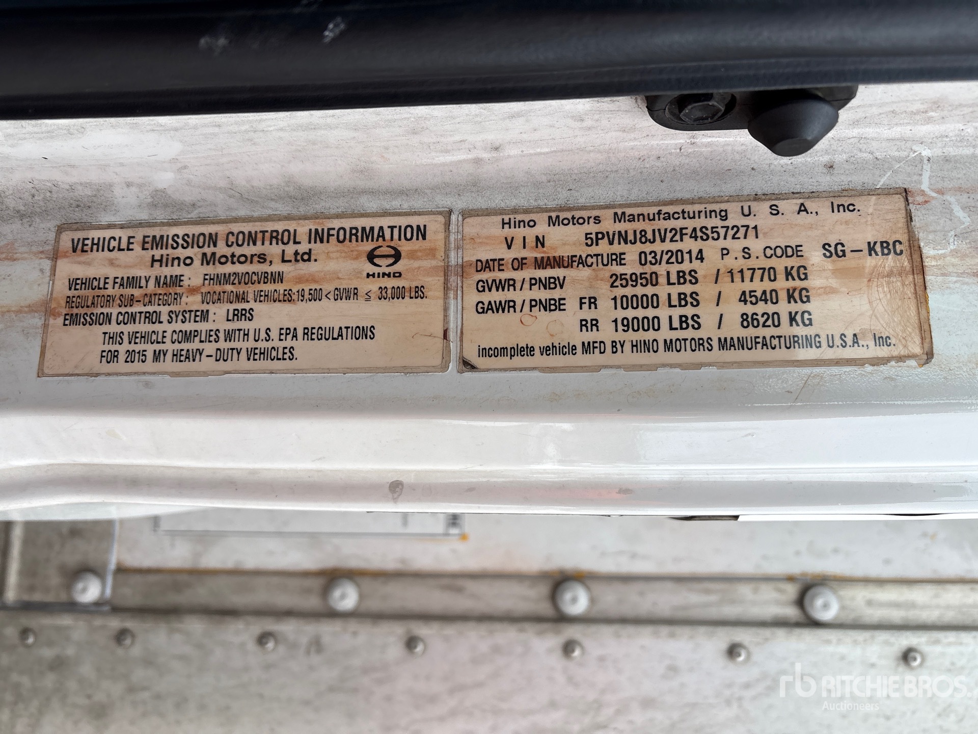 The detailed equipment information is limited in scope, and Ritchie Bros. Auctioneers has not inspected any aspects or components of the equipment other than those expressly set forth herein. Unless expressly stated, we make no representations or warranties, express or implied, concerning the equipment or its components, including without limitation any representations or warranties concerning functionality, conformity or compliance with any safety standard or requirement of any applicable authority or regulatory body, fitness for any particular purpose, or merchantability. You are strongly advised to perform your own detailed inspection of the equipment prior to bidding.