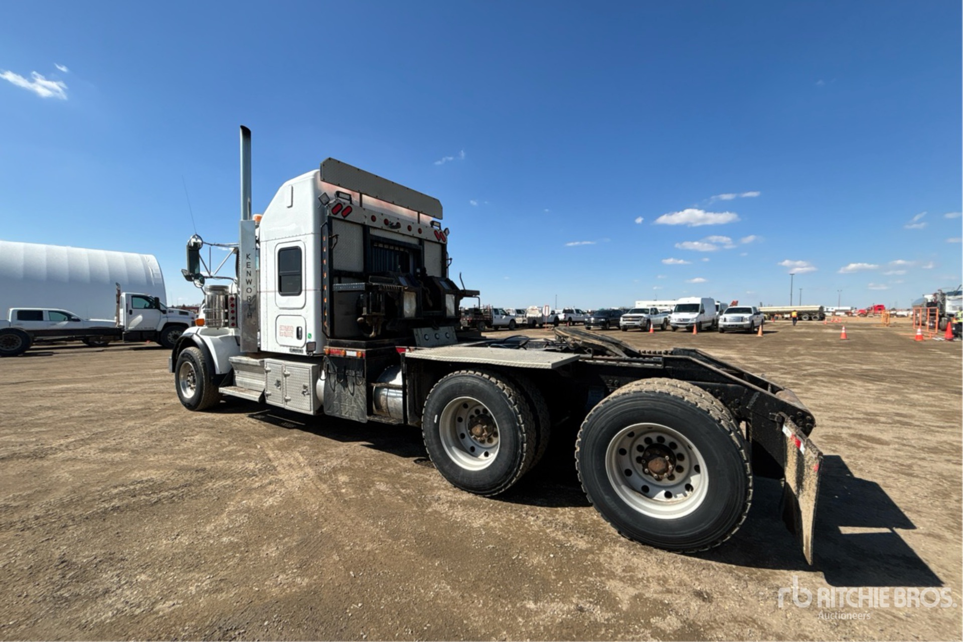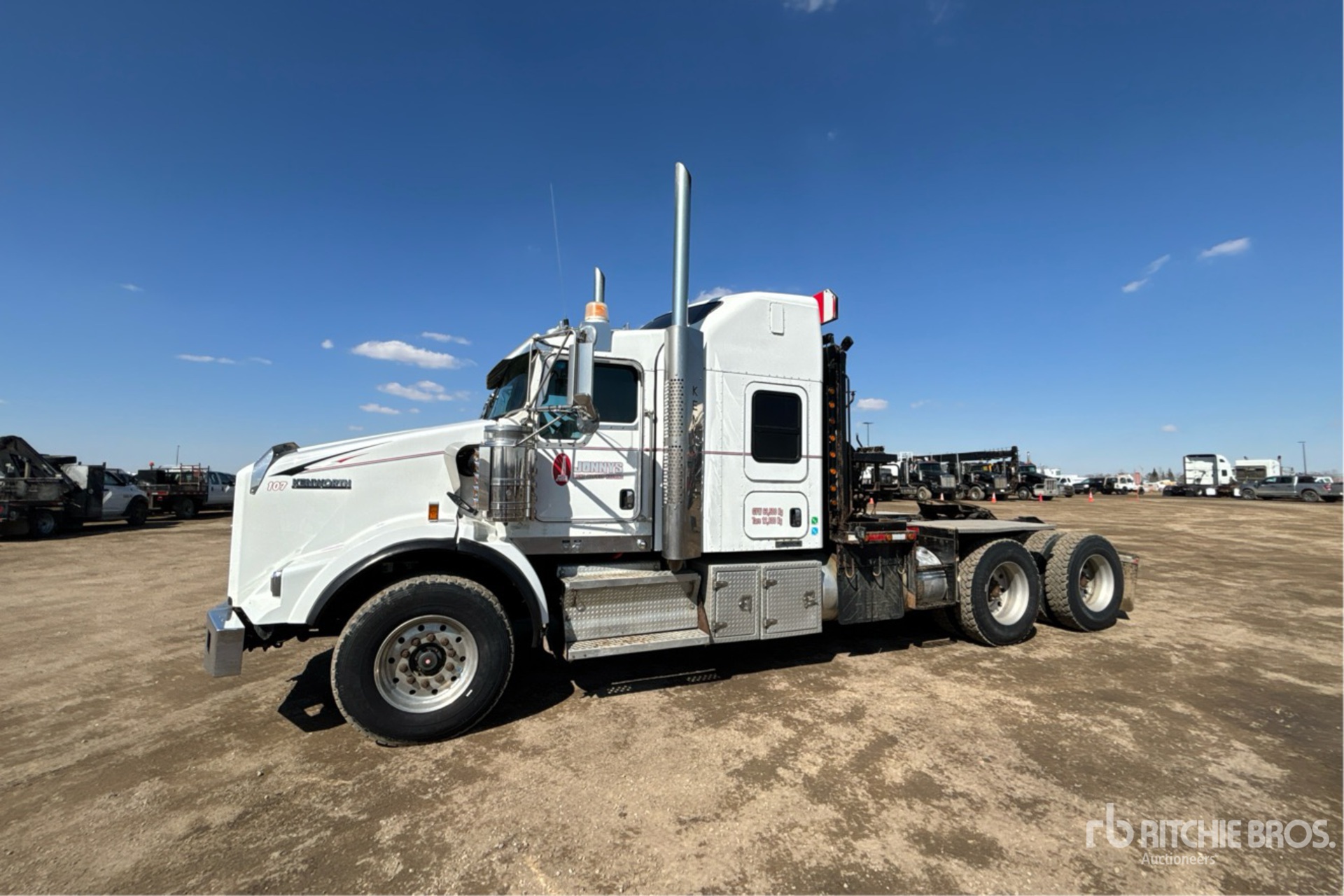 Cummins ISX15 6 Cylinder 15 L Diesel 550 hp Engine, Positive Air Shutoff, 27905 Engine hrs, Engine Brake, Eaton Fuller RTLO-18918B 18-Speed Manual Transmission, Double Differential Locks, 18000 lb Front Axle, 46000 lb Rears, Dana D46-170HP Drive Axles, 4.30:1 Axle Ratio, 64000 lb GVWR, Air Ride Cab, 62 in Mid Roof Sleeper Cab, Aluminum Wheels, 385/65R22.5 Front Tires, 11R24.5 Rear Tires, Dual Steering Boxes, Double Frame, Neway Air Ride Suspension, 246 in Wheelbase, PTO, Tail Roll, Rufnek Winch, Lowboy Ramps, Realignment-for-Jonnys-Light-Oilfield-Hauling-Ltd