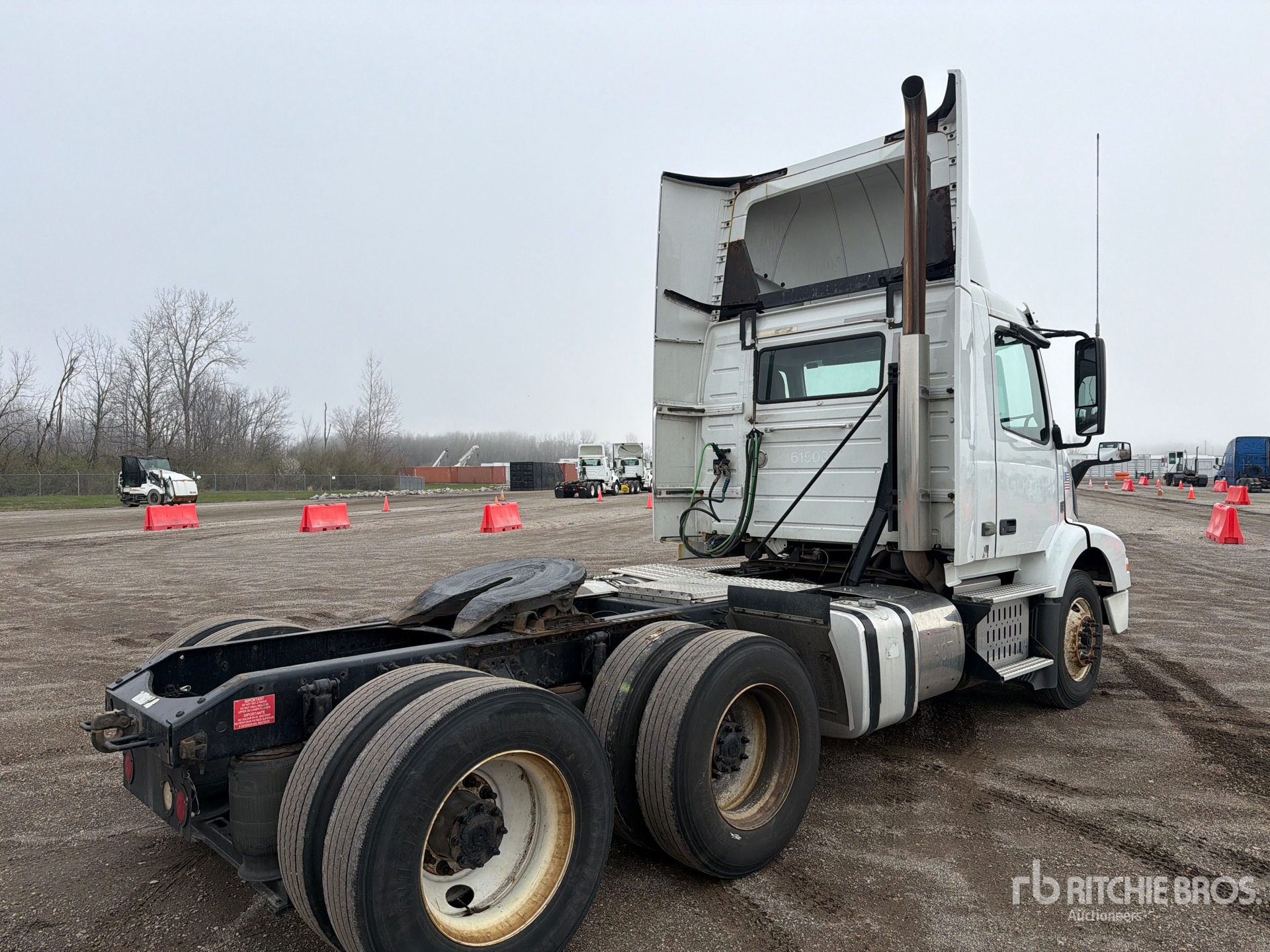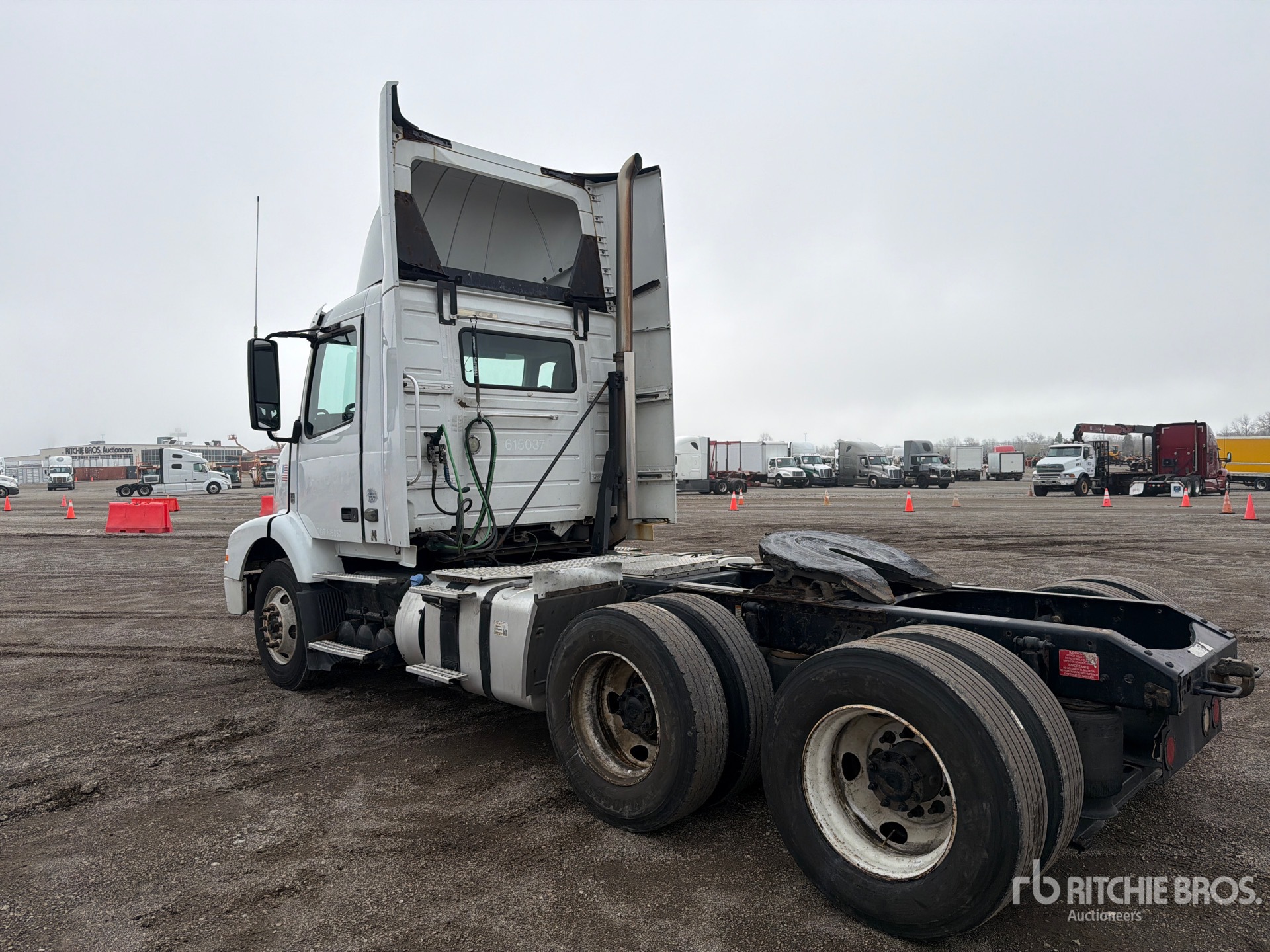 Volvo D11J 385 hp Engine, 2015 US EPA Label, 12441.7 Engine hrs, Eaton Fuller FR-14210B 10-Speed Manual Transmission, 12000 lb Front Axle, 38000 lb Rears, 50000 lb GVWR, Engine Brake, 177 in Wheelbase, Air Suspension, 275/80R22.5 Front Tires, 295/80R22.5 Rear Tires, Air Sliding 5th Wheel, Dual Fuel Tanks