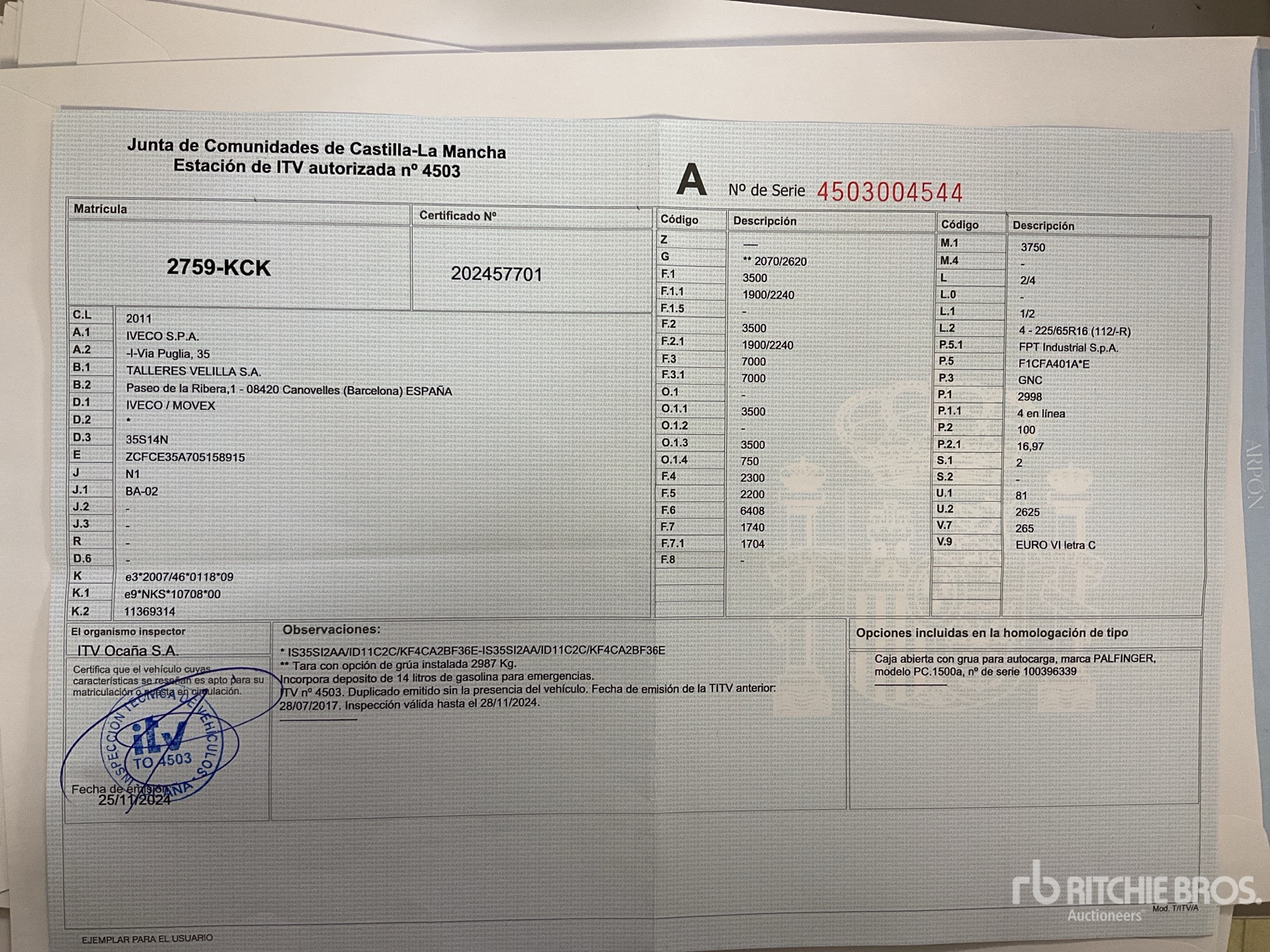 Matriculado en Espana, ITV pendiente a cuenta comprador/ Spanish Registration, Technical Inspection pending**SOLO PARA EL MERCADO NACIONAL Y EUROPEO/ ONLY FOR EUROPE MARKET, THIS LOT CAN NOT BE EXPORTED OUTSIDE OF EUROPE, for more information, please contact our office**SOLO SE PODRA RETIRAR EL VEHICULO UNA VEZ TRAMITADO EL CAMBIO DE NOMBRE**THE VEHICLE MAY ONLY BE REMOVED ONCE THE TITLE IS CANCELED IN TRAFFIC OFFICE**
