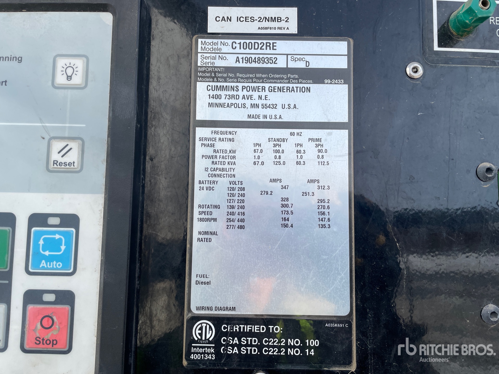 2019 US EPA Label, CARB Compliant, Cummins 4 Cylinder 126 kW 4.5 L Diesel Engine, Requires Diesel Exhaust Fluid, Positive Air Shutoff, 125 kVA/100 kW Rated 3 Phase Output, 277 V / 480 V Rated Voltage, 60.3 kVA,/60.3 kW, Rated Single Phase Output, Sound Attenuated, Bottom Mounted Fuel Tank, Lunette Ring Carrier Trailer