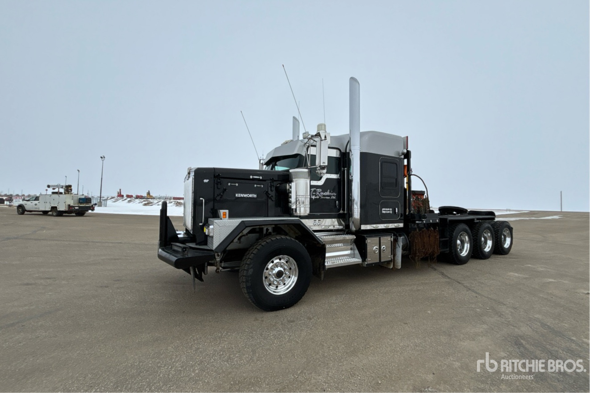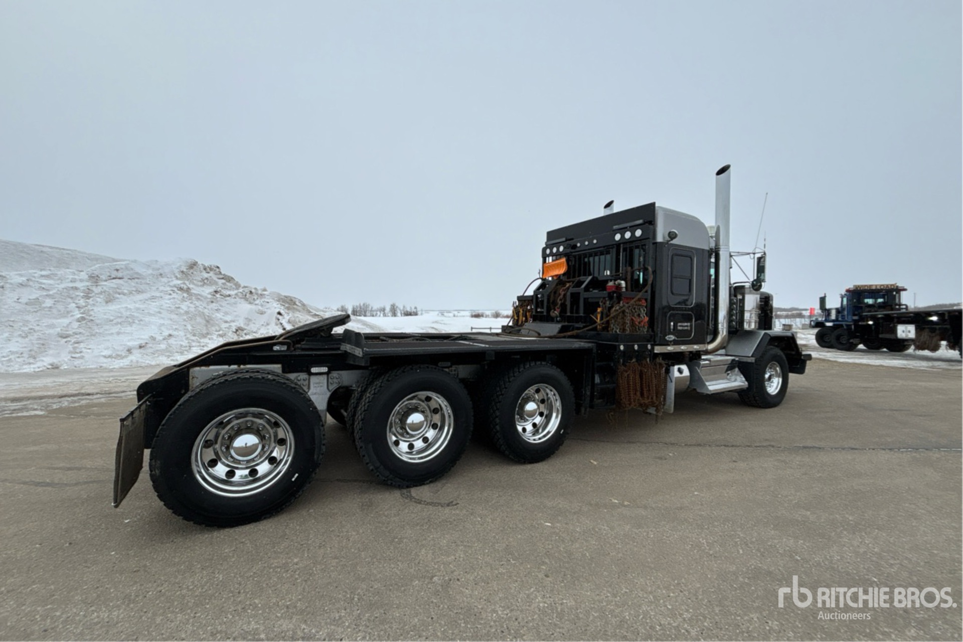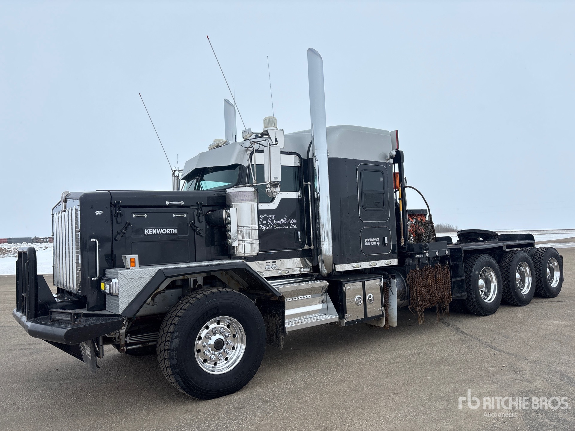 Cummins X15 6 Cylinder Diesel 605 hp Engine, 2018 US EPA Label, Engine Coolant Heater, Positive Air Shutoff, Webasto Engine Coolant Heater, 4404 Engine hrs, Engine Brake, Eaton Fuller RTLO-20918B 18-Speed Manual Transmission, Triple Differential Locks, 19780 lb Front Axle, 61000 lb Rears, Meritor RZ-XX-166PWT Drive Axles, 4.56:1 Axle Ratio, 80000 lb GVWR, Air Ride Cab, 52 in Mid Roof Sleeper Cab, Aluminum Wheels, 445/65R22.5 Front Tires, 11R24.5 Rear Tires, Dual Steering Boxes, Double Frame, Neway Air Ride Suspension, 266 in Wheelbase, PTO, Tail Roll, Tulsa 60000 kg Winch, Lowboy Ramps, Complete-Dispersal-for-T-Ruckin-Oilfield-Services-Ltd