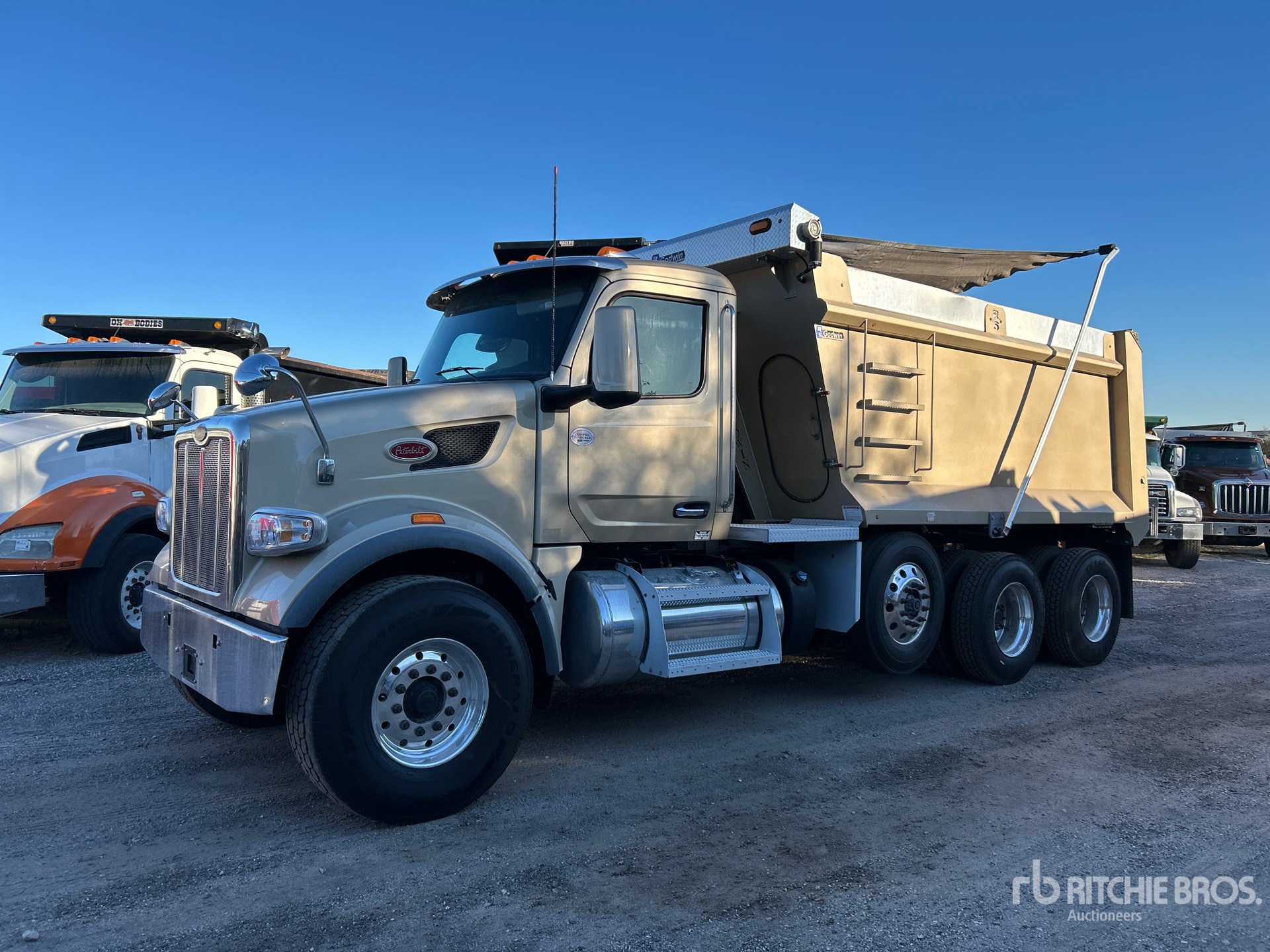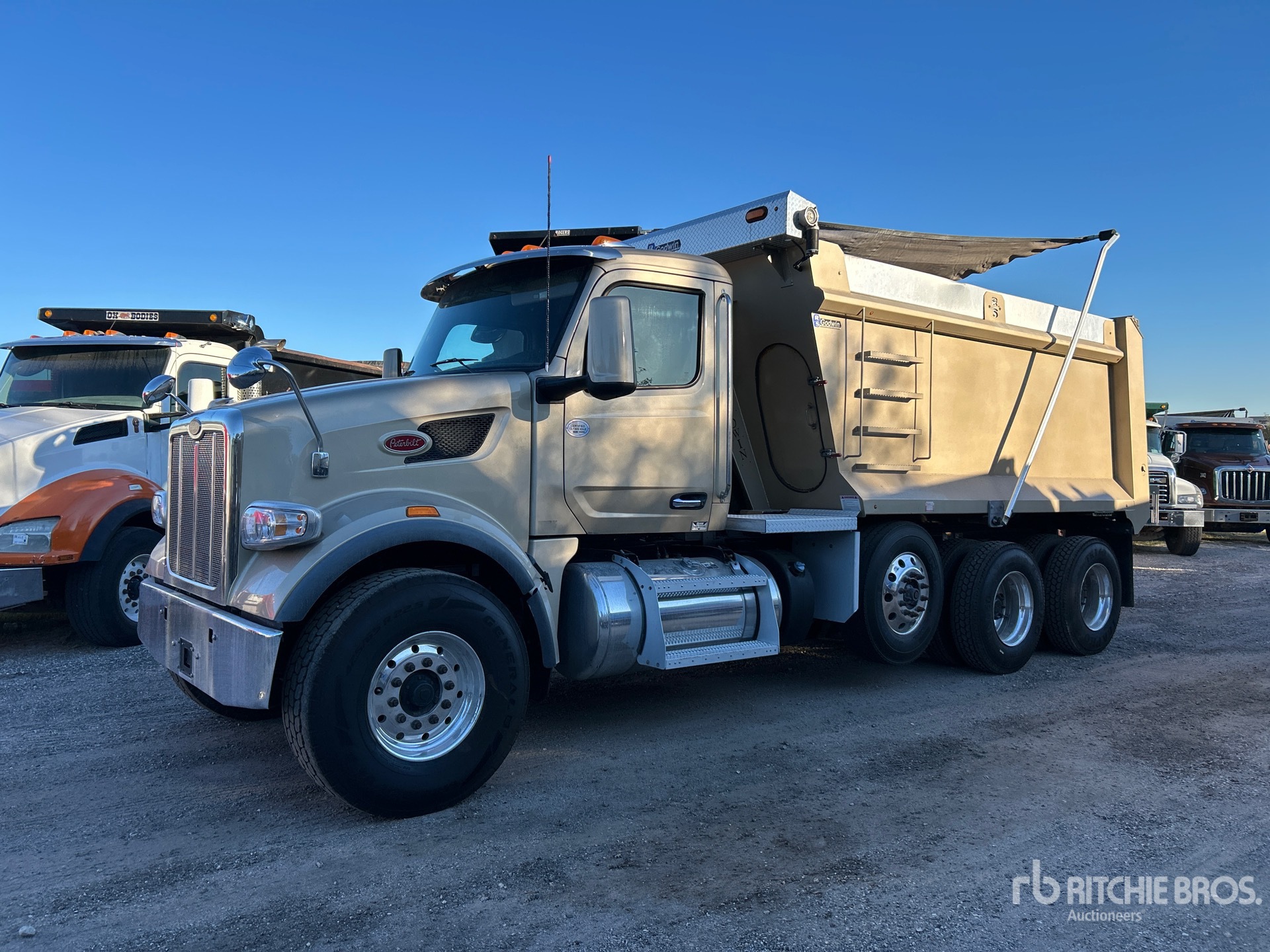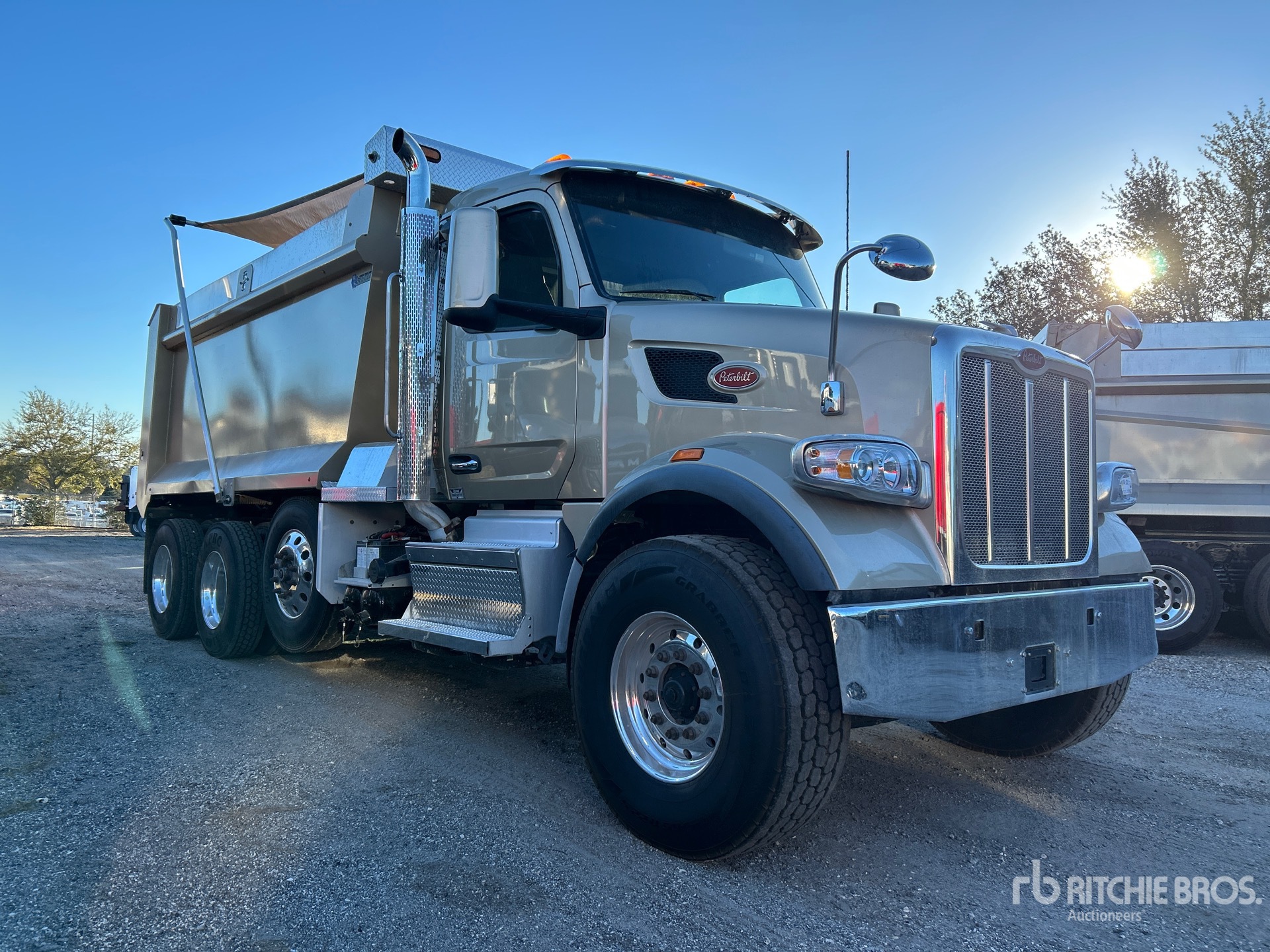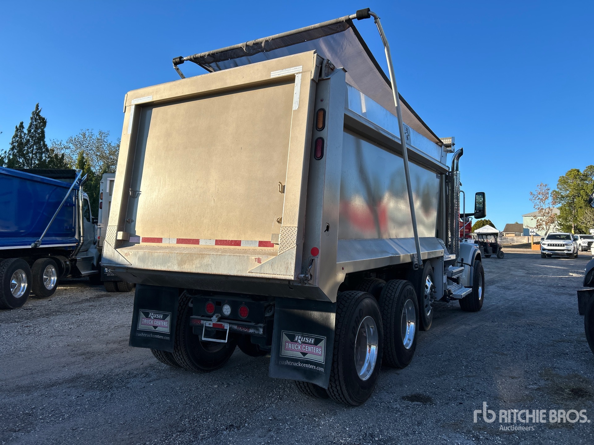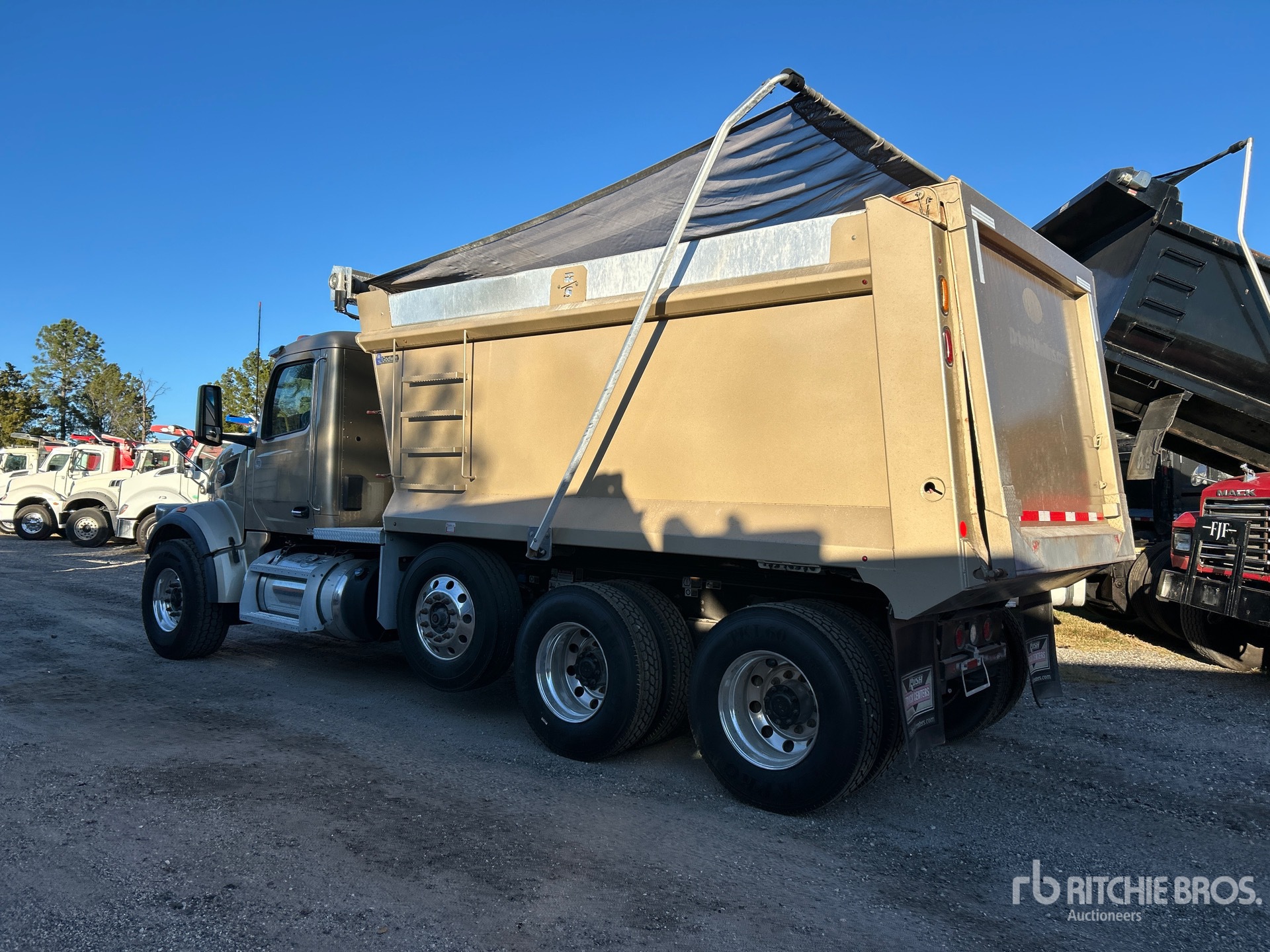 Located in Lane 65 Spot 4, Paccar Diesel Engine, Requires Diesel Exhaust Fluid, Engine Brake, Automated Transmission, Double Differential Locks, 20000 lb Front Axle, 46000 lb Rears, 78350 lb GVWR, Air Ride Cab, Aluminum Wheels, 425/65R22.5 Front Tires, 11R22.5 Rear Tires, Steerable Air Lift Pusher Axle, Steerable Air Lift Tag Axle, Air Trac Air Ride Suspension, 230 in Wheelbase, PTO, 14 ft 7 in Long x 6 ft 2 in High Steel Body, Electric Roll Tarp, Equipment-from-Daniel-Mullins-Trucking