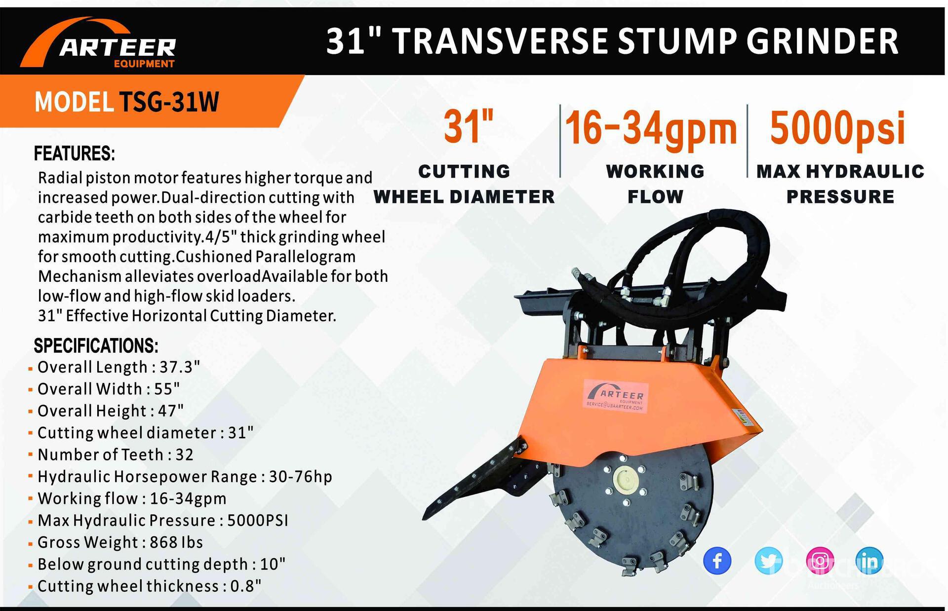 2026 ARTEER TSG-31W 31 in Transverse Skid Steer Stump Grinder (Unused)