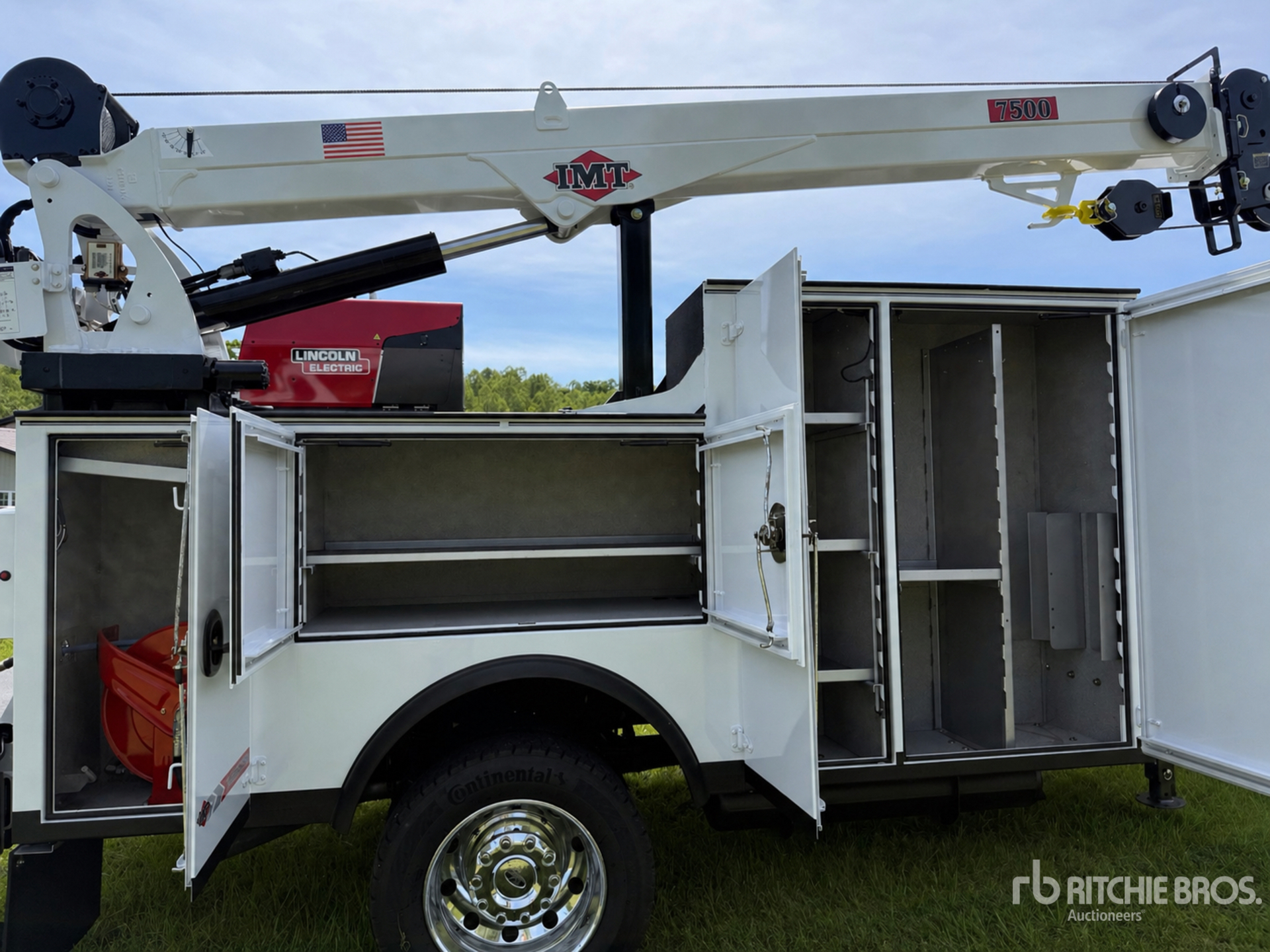 Ford 6.7 L Diesel Engine, 2025 US EPA Label, Requires Diesel Exhaust Fluid, Automatic Transmission, 6500 lb Front Axle, 14706 lb Rears, 19500 lb GVWR, 225/70R19.5 Tires, Aluminum Wheels, Spring Suspension, 192 in Wheelbase, PTO, IMT DOM1S3 11 ft Body, Hydraulic Stabilizers, IMT 7500-30 7500 lb 3 Section Hydraulic Crane, Wireless Remote Control, Lincoln Gasoline Generator Set, Hydraulic Air Compressor, Air Hose Reel, Lincoln 10500 W 225 A Gasoline Welder