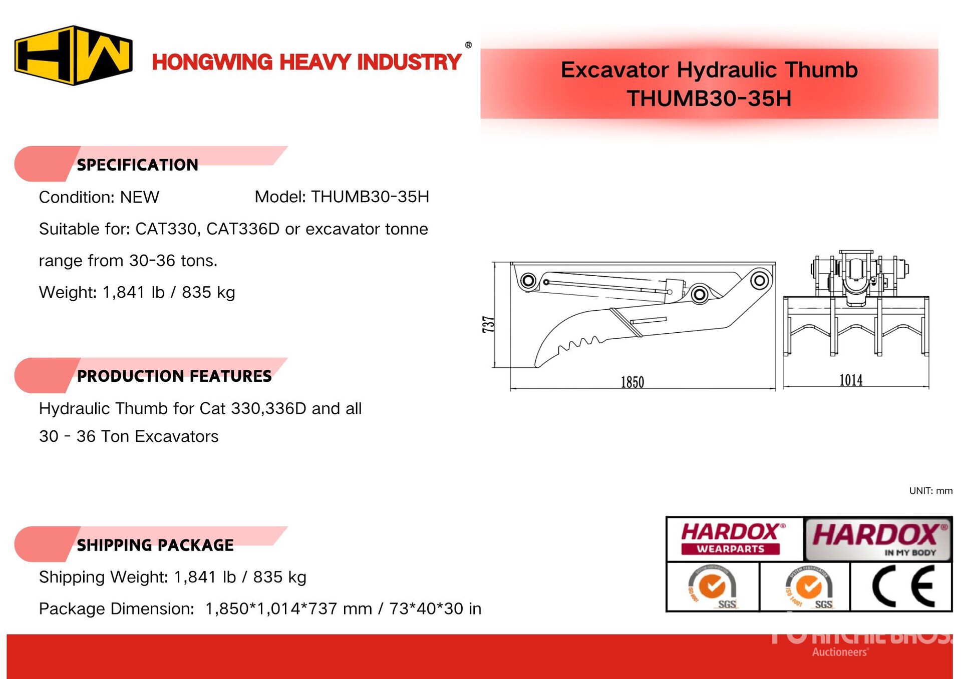 2026 HW THUMB30-35H 39 in Hydraulic Excavator Thumb - Fits Cat 330, 336D / 30 - 36 ton (Unused)