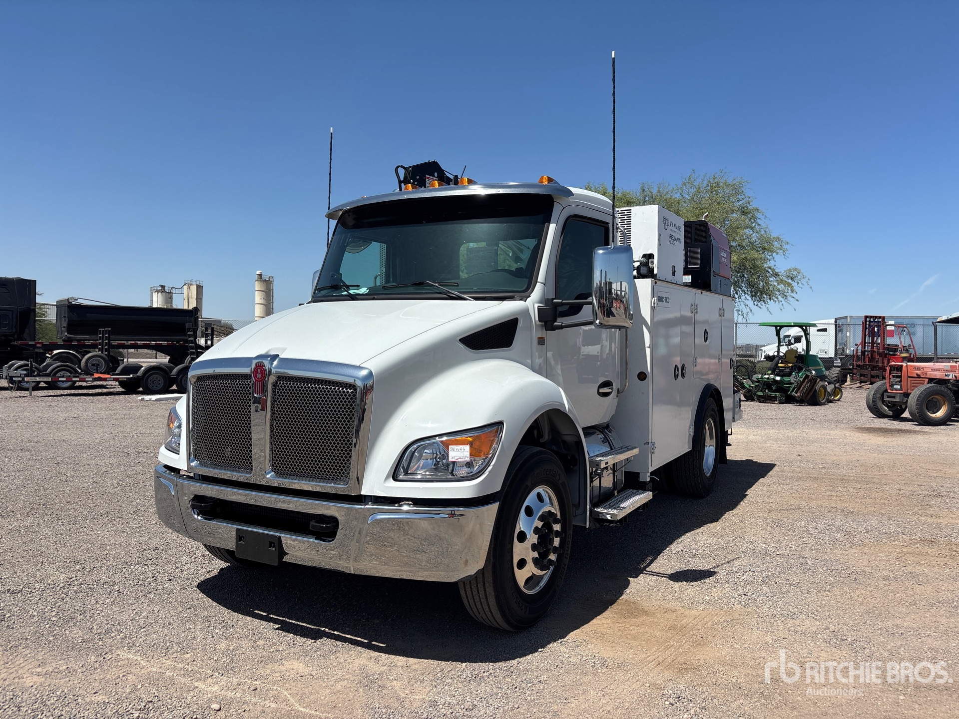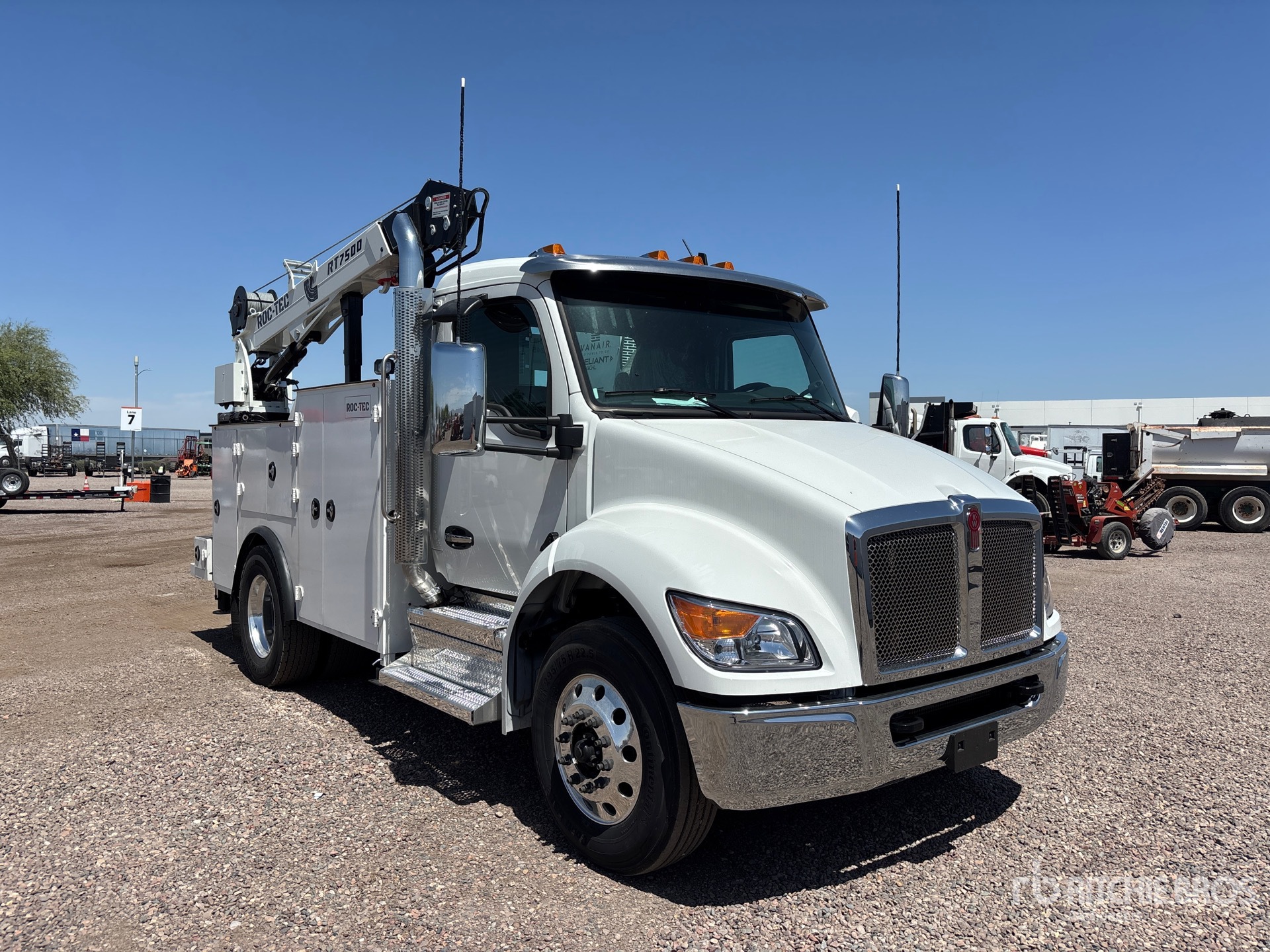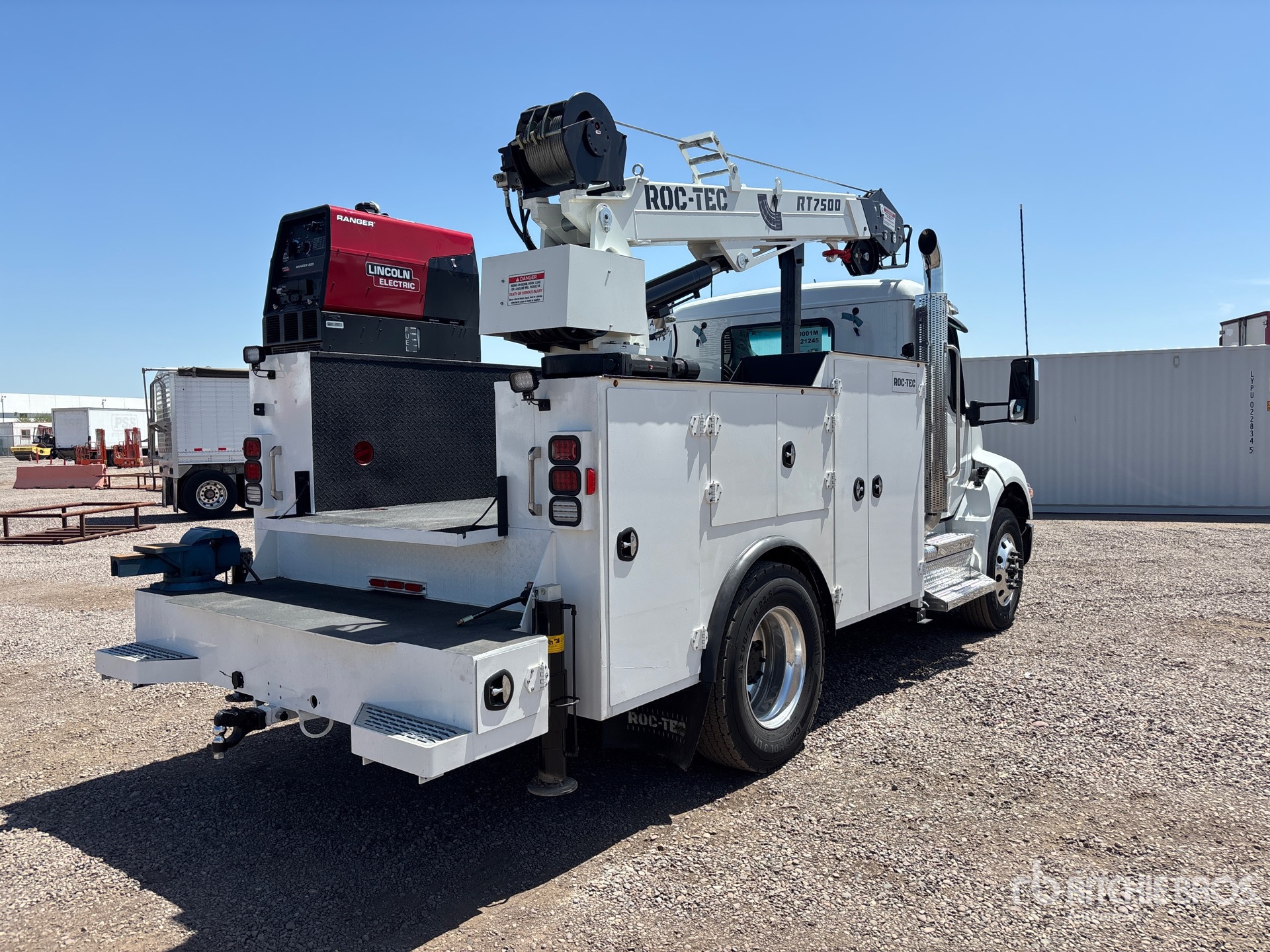 Paccar 6 Cylinder 6.7 L Diesel Engine, 2025 US EPA Label, 27 Engine hrs, 10000 lb Front Axle, 16000 lb Rears, 26000 lb GVWR, Aluminum Wheels, 295/75R22.5, Paccar Air Ride Suspension, 158 in Wheelbase, PTO, 10 ft Body, Hydraulic Stabilizers, ROC Tec RT 7500 6880 lb 3 Section Hydraulic Crane, Wireless Remote Control, Vanair RC40-l Air Compressor, Lincoln Ranger 225 Petrol Welder
