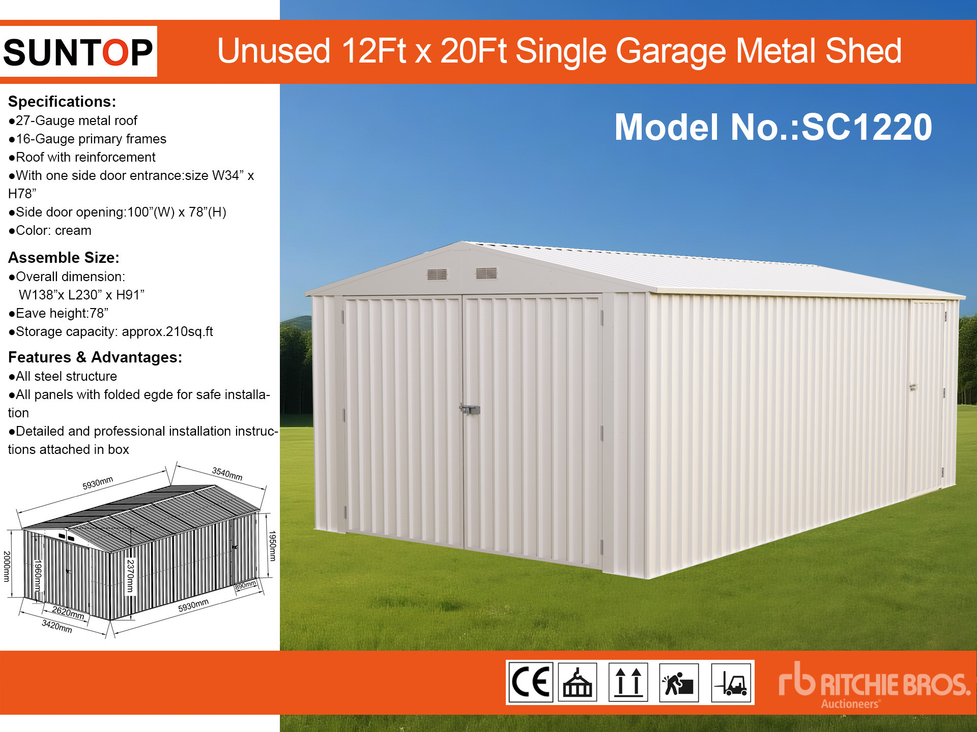 2026 SUNTOP SC1220 12 ft x 20 ft Single Garage Metal Shed (Unused)