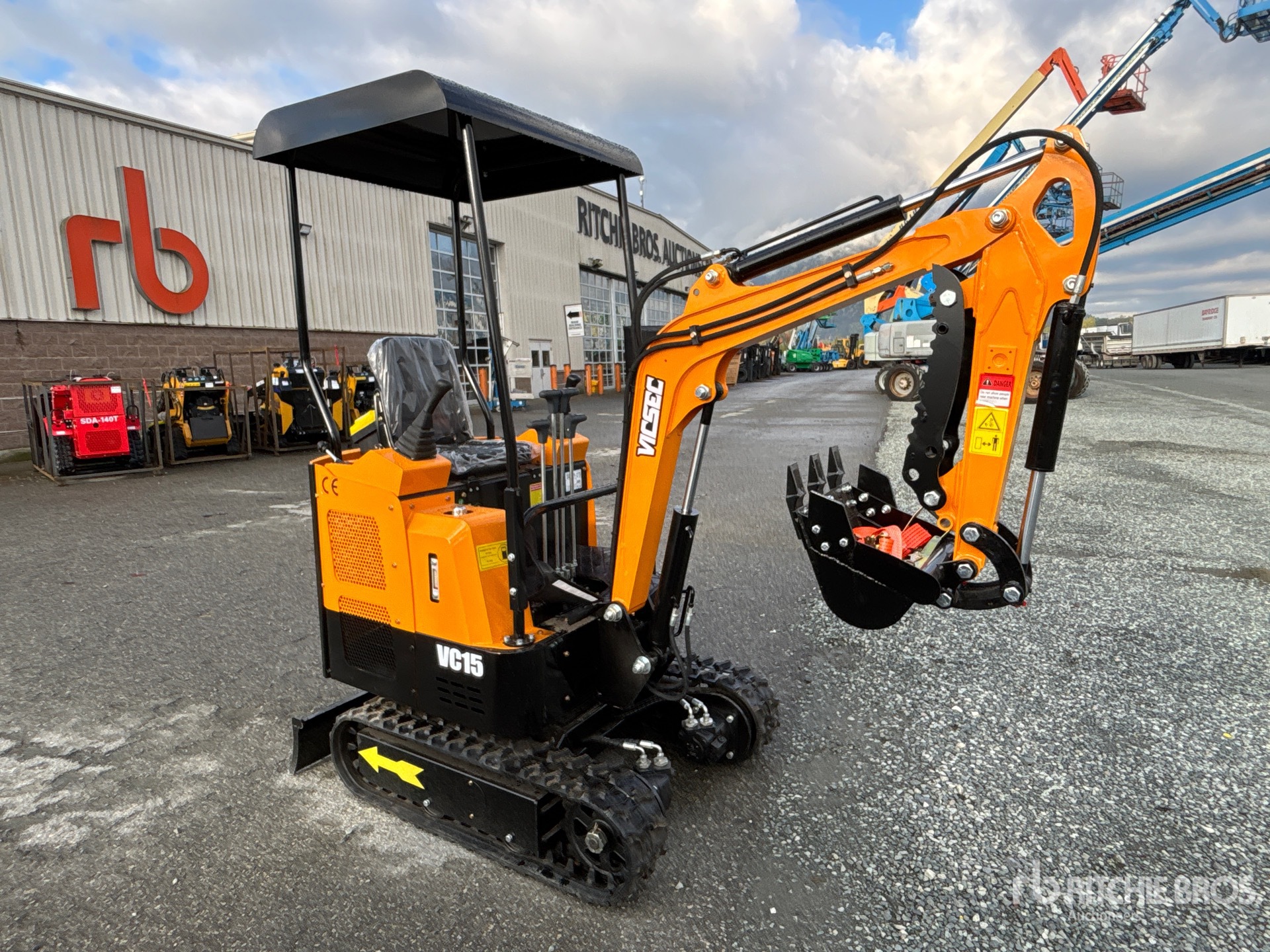 2025 US EPA Label, 3 ft 2 in Stick, Auxiliary Hydraulic Plumbing, Backfill Blade, 7 in Rubber Tracks, 16 in Digging Bucket, Manual Thumb, Product images displayed are stock photos. Item is new/unused.