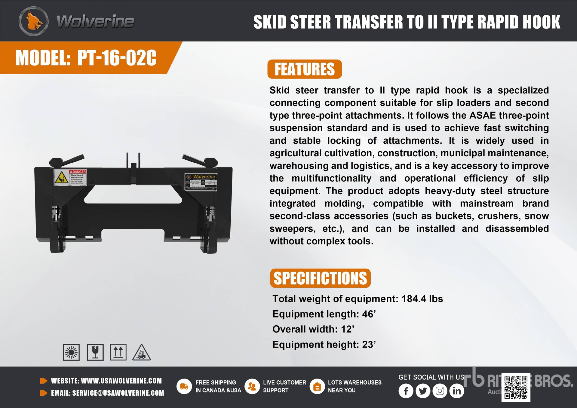 2026 Wolverine PT-16-02C Skid Steer 3-Point Adapter (Unused)