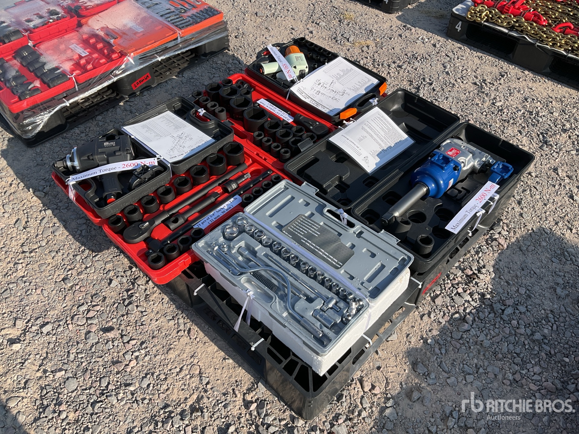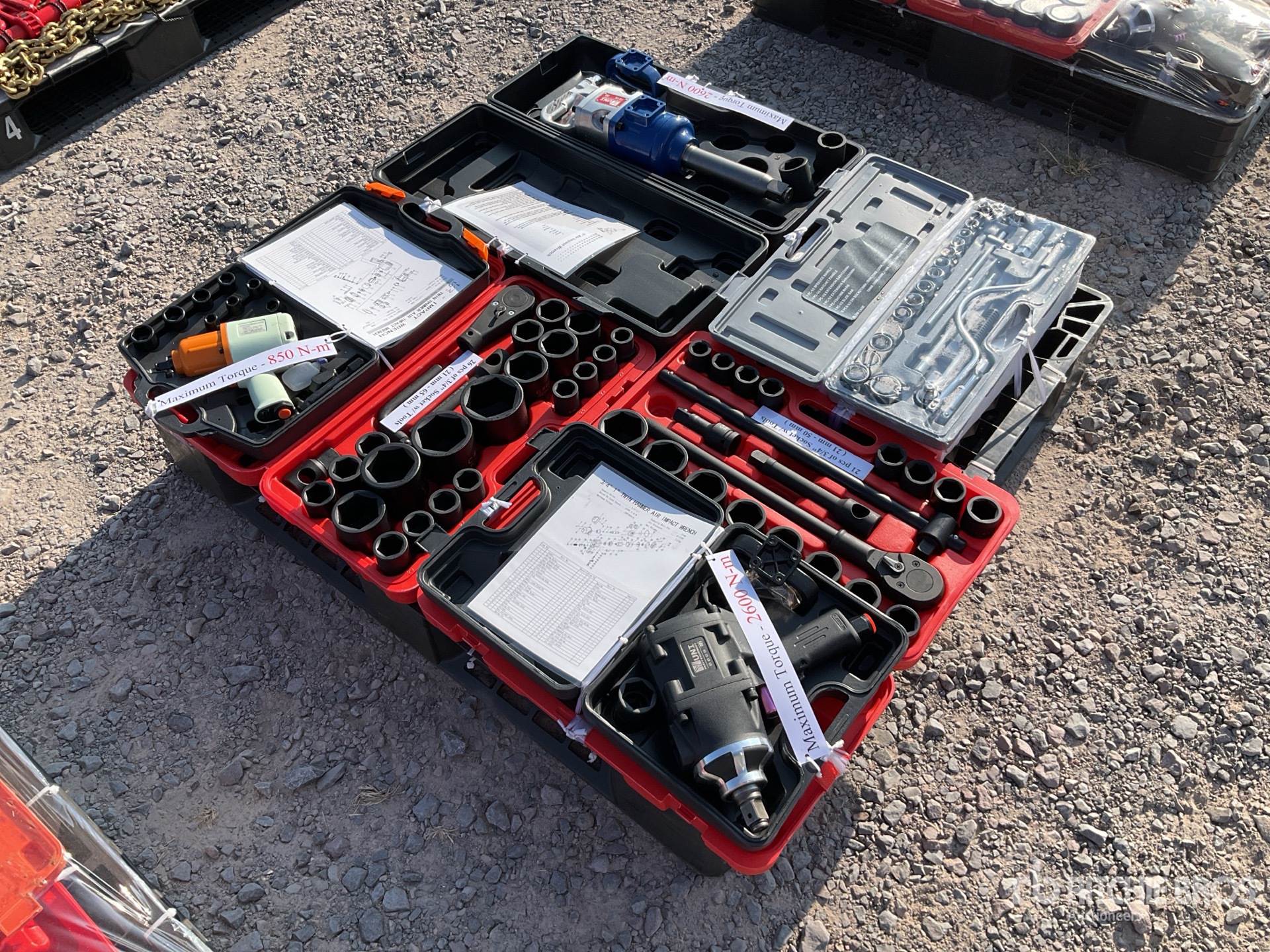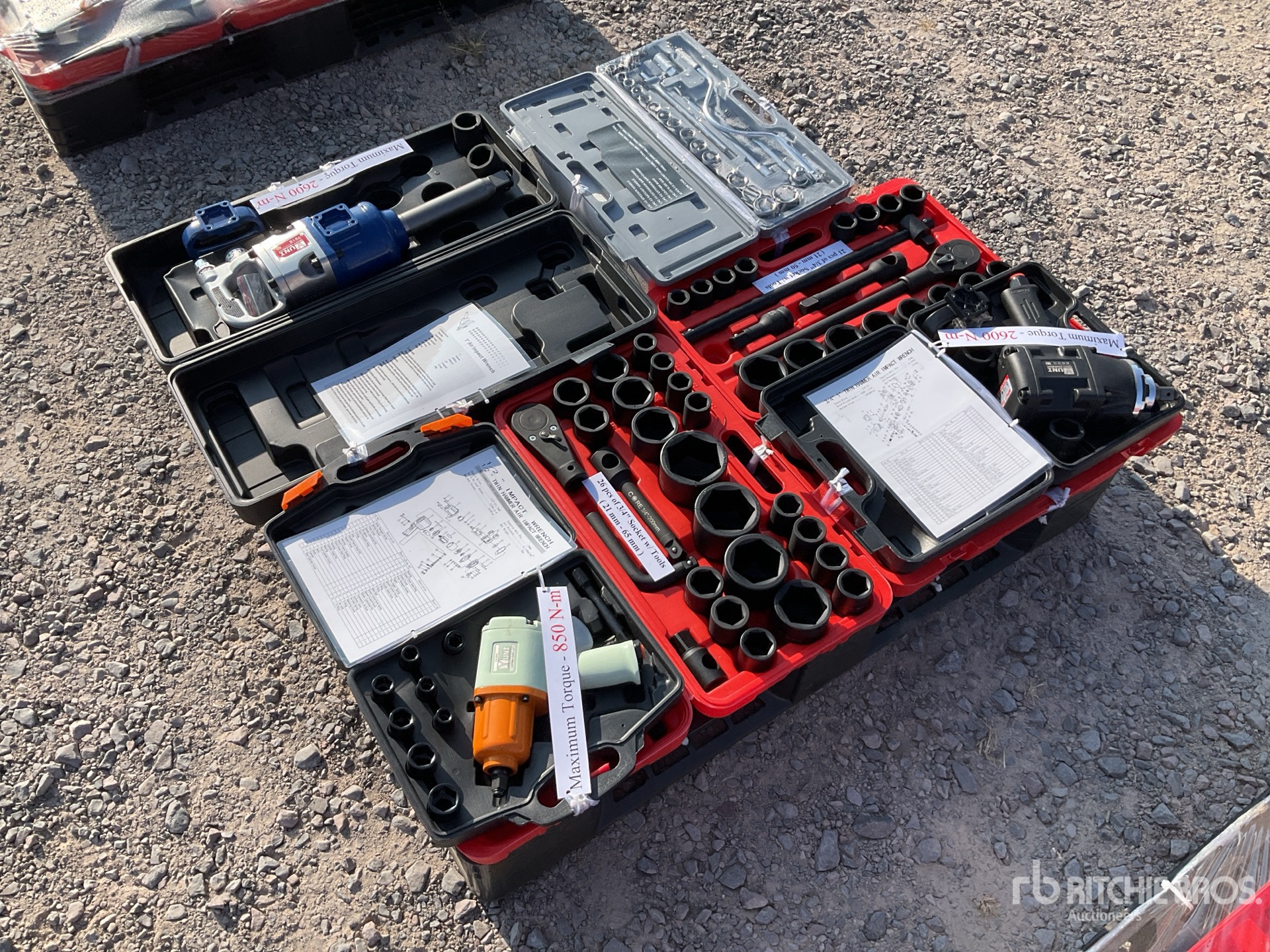 (1) 1" Air Impact Wrench, (1) 3/4" Air Impact Wrench, (1) 1/2" Air Impact Wrench, (3) Socket Set // Las imagenes mostradas son fotos de stock. El articulo no ha sido usado / Product images displayed are stock photos. Item is new/unused
