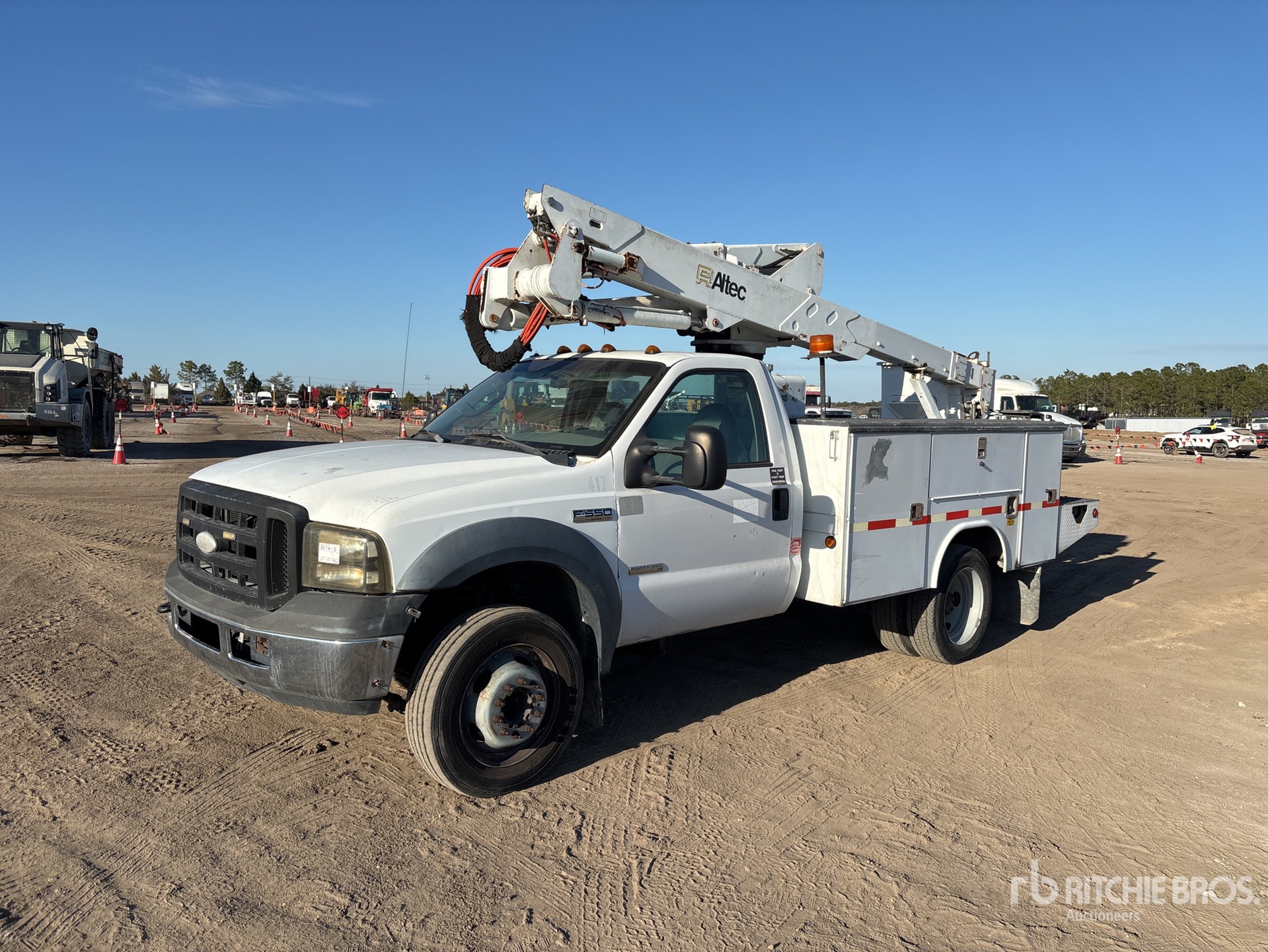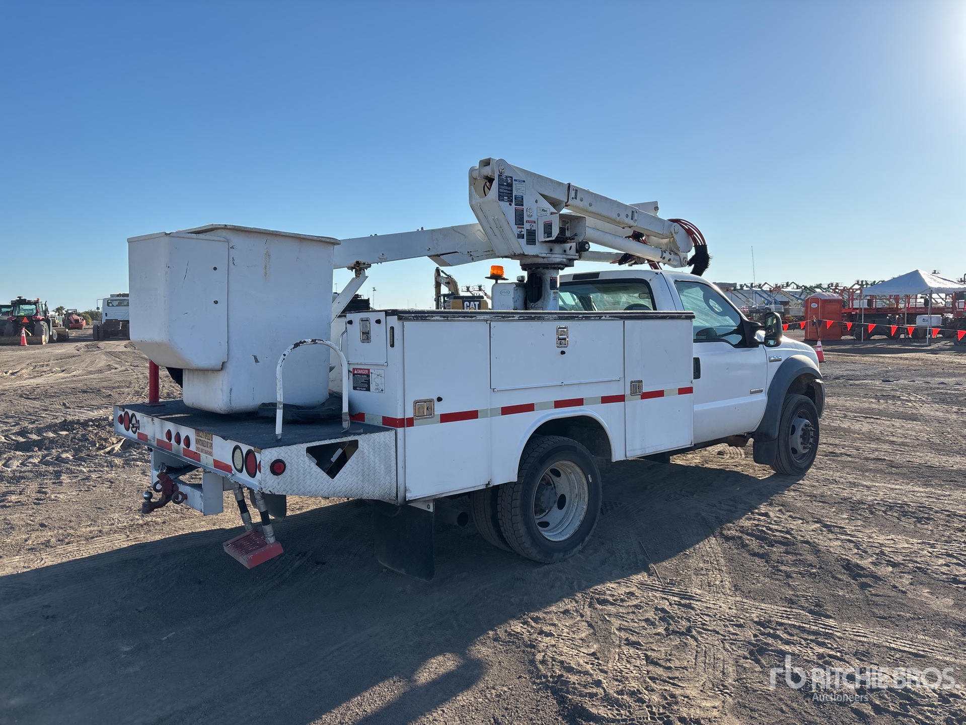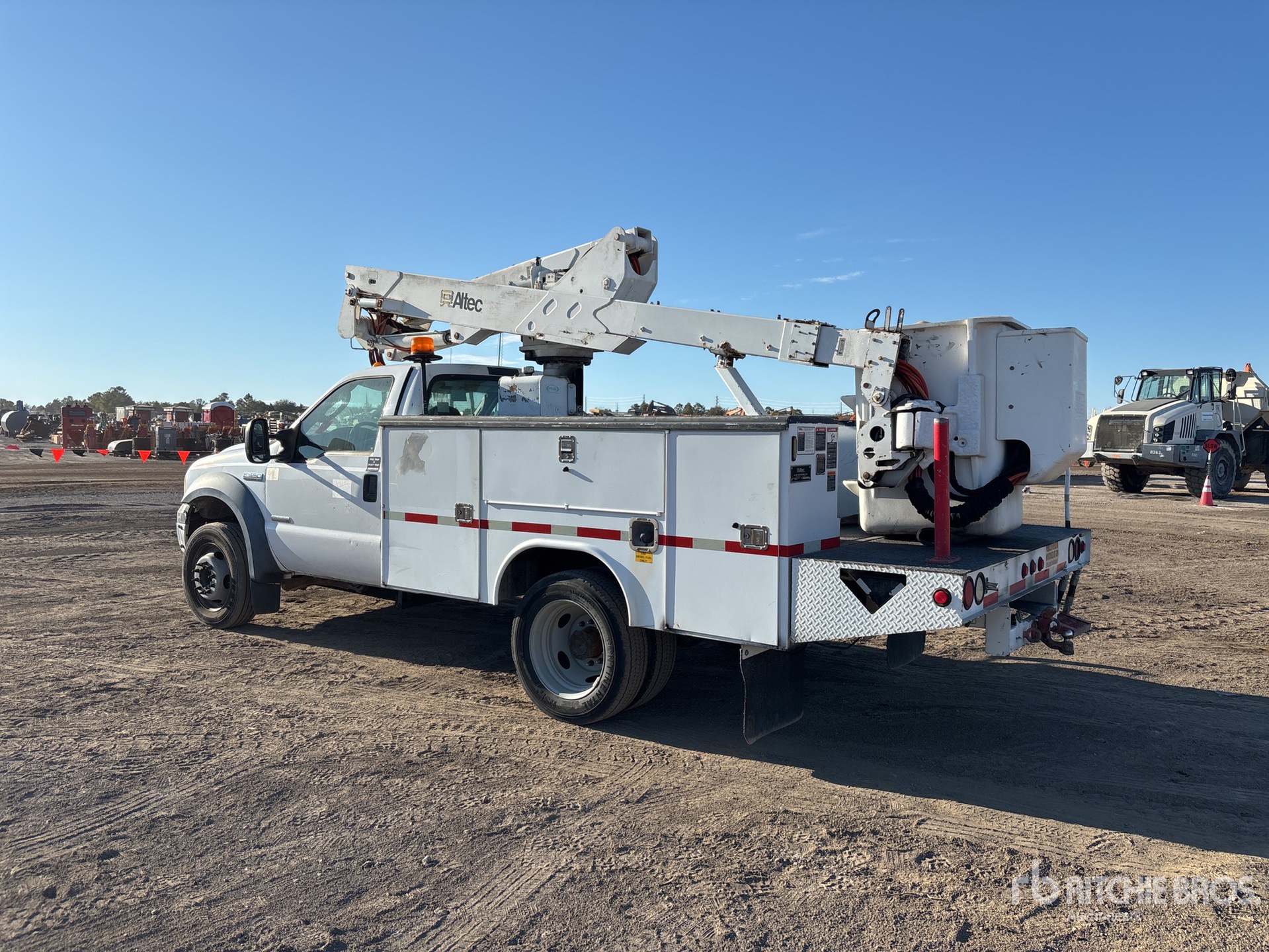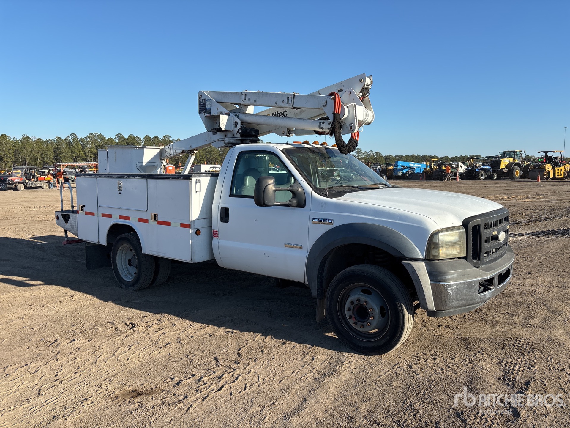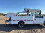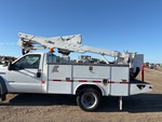 Ford Powerstroke V8 Diesel Engine, 9999 Engine hrs, Automatic Transmission, 6500 lb Front Axle, 13660 lb Rears, 17950 lb GVWR, 225/70R19.5, Spring Suspension, 141 in Wheelbase, PTO, 400 lb Capacity, Center Mounted, One-Person Articulating-Telescopic Boom, Lower Boom Fiberglass Insert, Utility Body, 9 ft x 94 in Bed, Pintle Hitch
