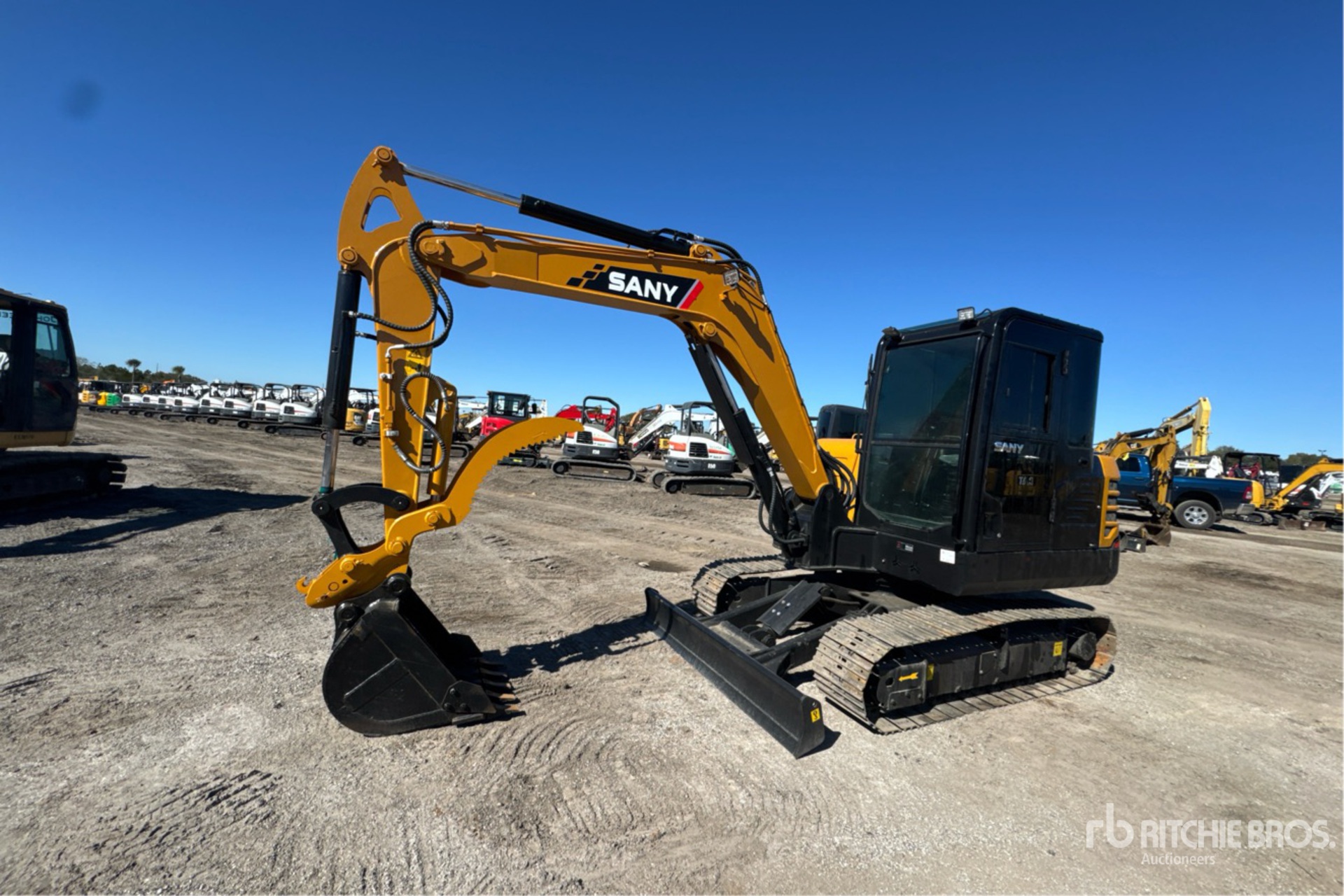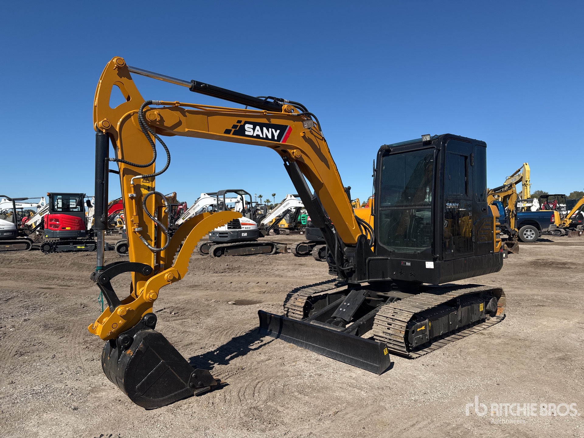 Enclosed Cab, Air Conditioner, 5 ft Stick, Auxiliary Hydraulic Plumbing, Backfill Blade, 15.75 in Triple Grouser Track Shoes, Manual Quick Coupler, 26 in Digging Bucket, Hydraulic Thumb